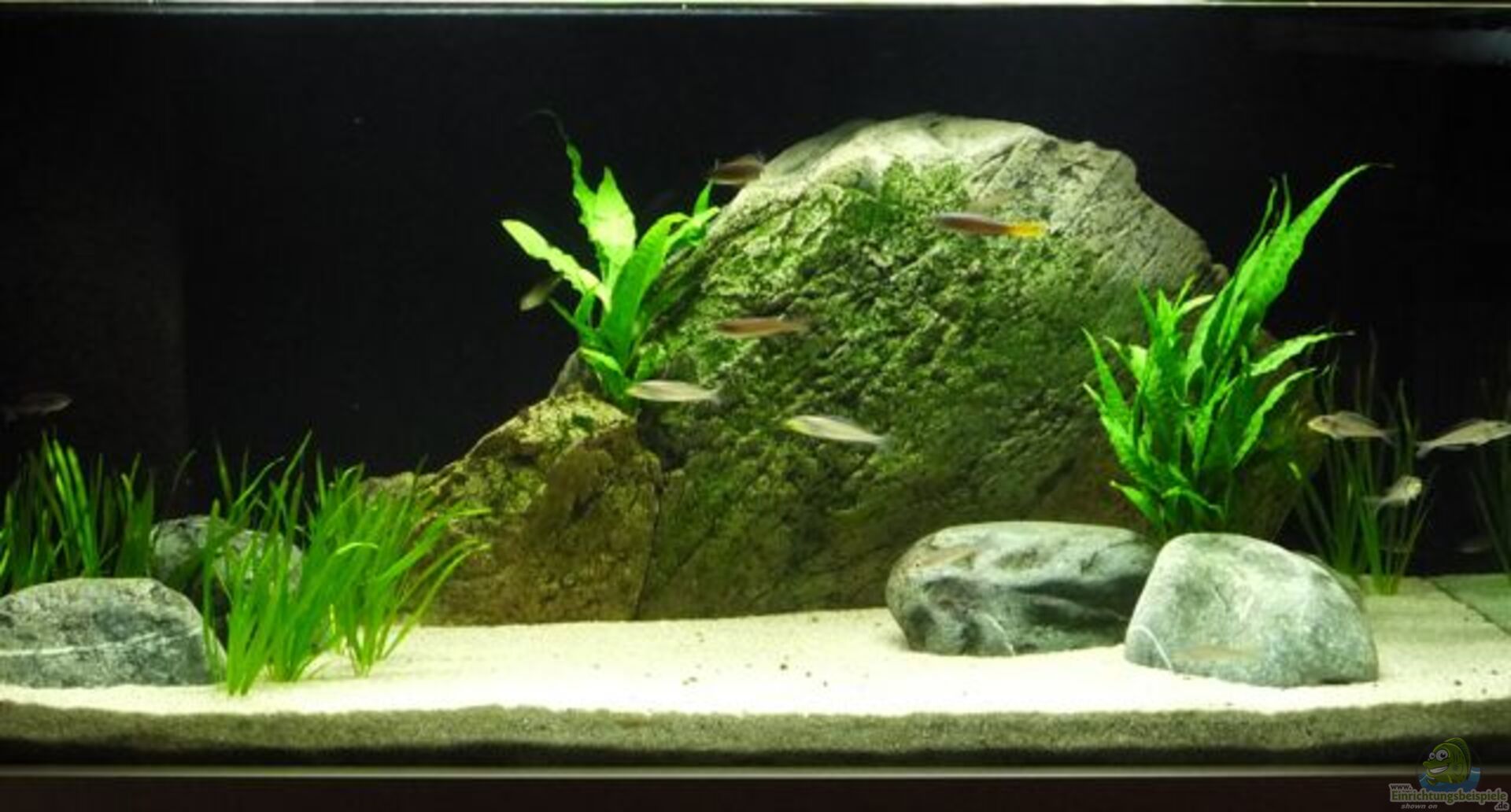 Ein Julidochromis Paar ist ausgezogen. Steine wurden auf Anregung etwas aufgestapelt, so ist ein wenig mehr Sandfläche für die Sandcichliden entstanden.