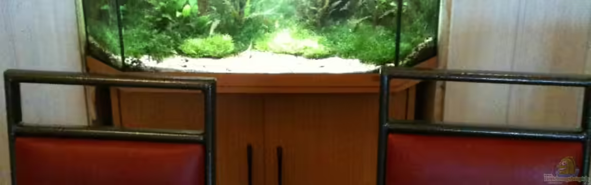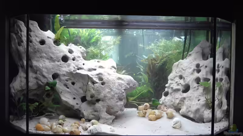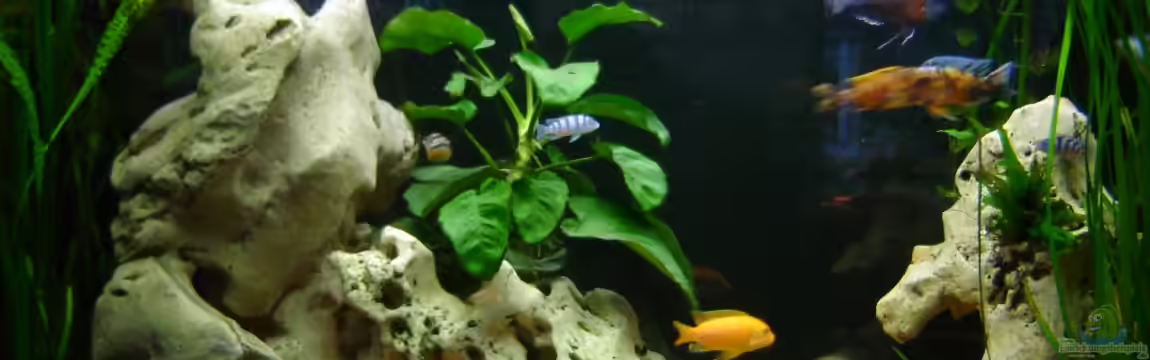 Die beiden Welten sind sehr unterschiedlich, dieses Tanganjikabecken ist von hellem Lochgestein und Sand dominiert und strahlt sehr kühles Licht aus, das andere ist ein dicht bepflanztes Aquarium mit satten grün und rot Tönen.