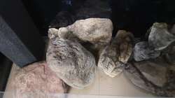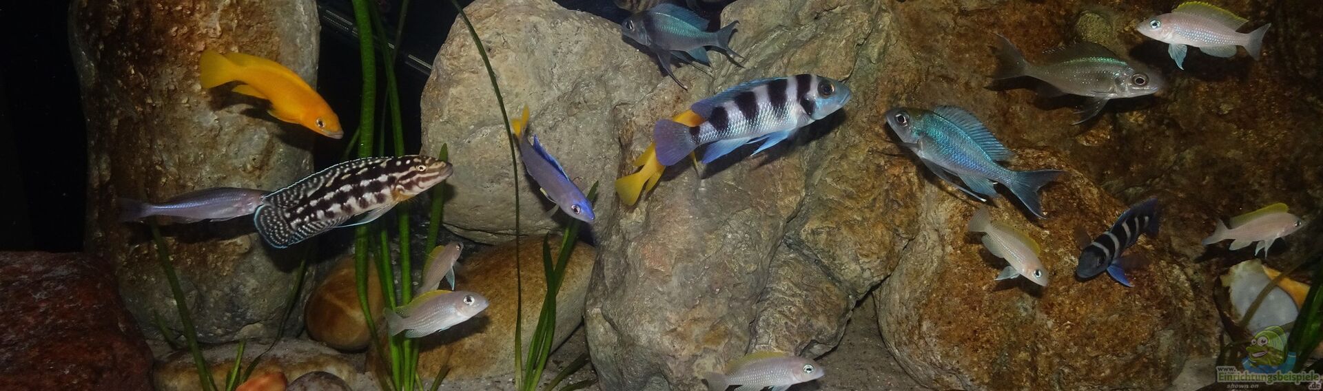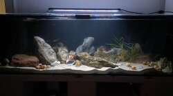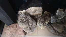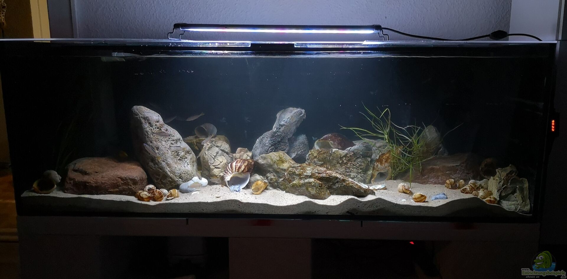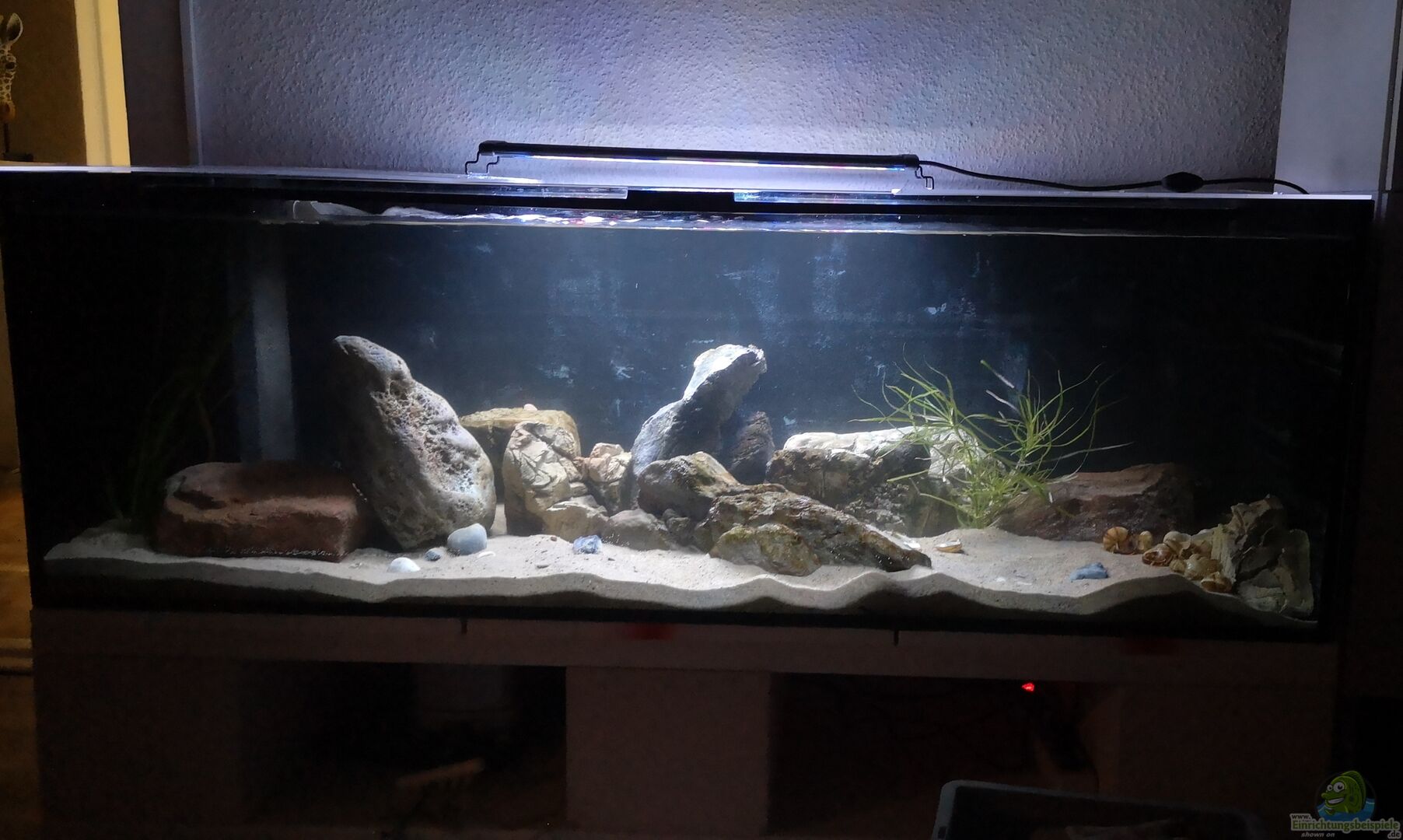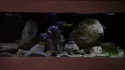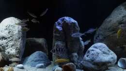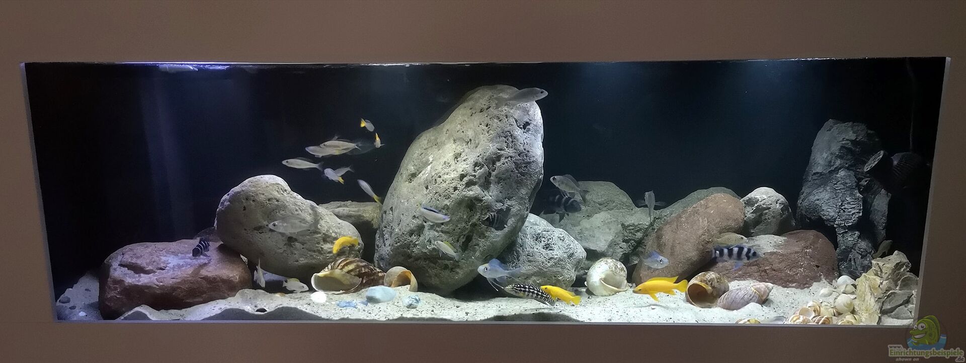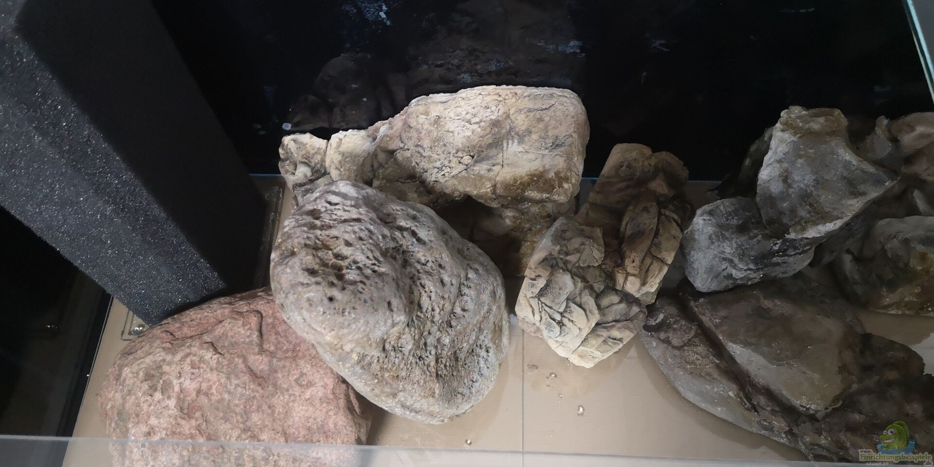 Die seeähnliche Kulisse wurde mithilfe von einer Kombination aus Rockzolid Riverstones und märkischen Feldsteinen, sowie ATG Modulen und diversen Schneckenhäusern (Achat und Weinberg) geschaffen. Aufgrund der Stapelung und bewusst überlappenden Anordnung der Eintichtungsgegenstände, konnten viele kleine Höhlen und Spalten für die vielen Höhlenmaulbrüter entstehen. Die senkrechte Position eines gro??en Riverstones sorgt für eine Sichtbarrikade, die vor allem den Bewohner der oberen Wasserregion zugute kommt. Am Boden werden die einzelnen Reviere, neben den Molluskenüberresten, zusätzlich durch verteilte selbstgesammelte, schön blau schimmernde Steine aus einem See im Speckmantel der Hauptstadt abgetrennt.