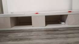Das Becken selbst ist übrigens an die restliche Wohnungseinrichtung angepasst und deshalb von einem wei??en Korpus aus Möbelbauplatten mit zwei Klappdeckeln für den schnellen Wasserwechsel, Keschern von Tieren oder Umbauarbeiten umgeben.