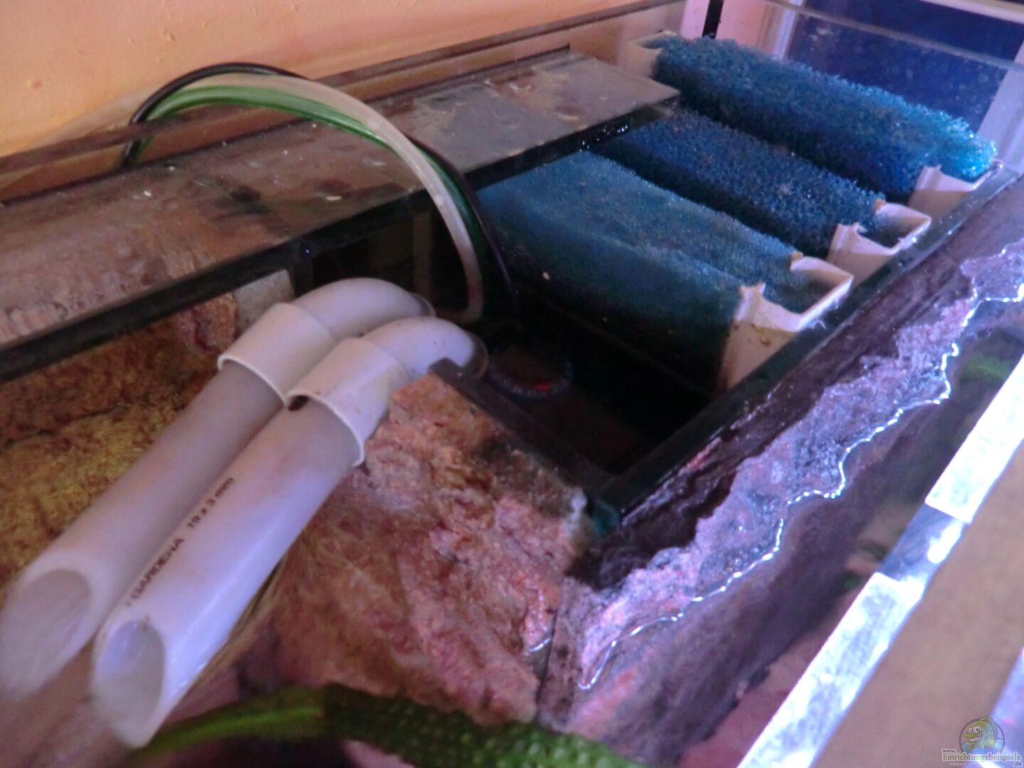 Gefiltert wird über 2 selbstgebaute Innenfilter welche mit 3 Filter Matten in verschiedenen Porengrö??en bestückt wurden.