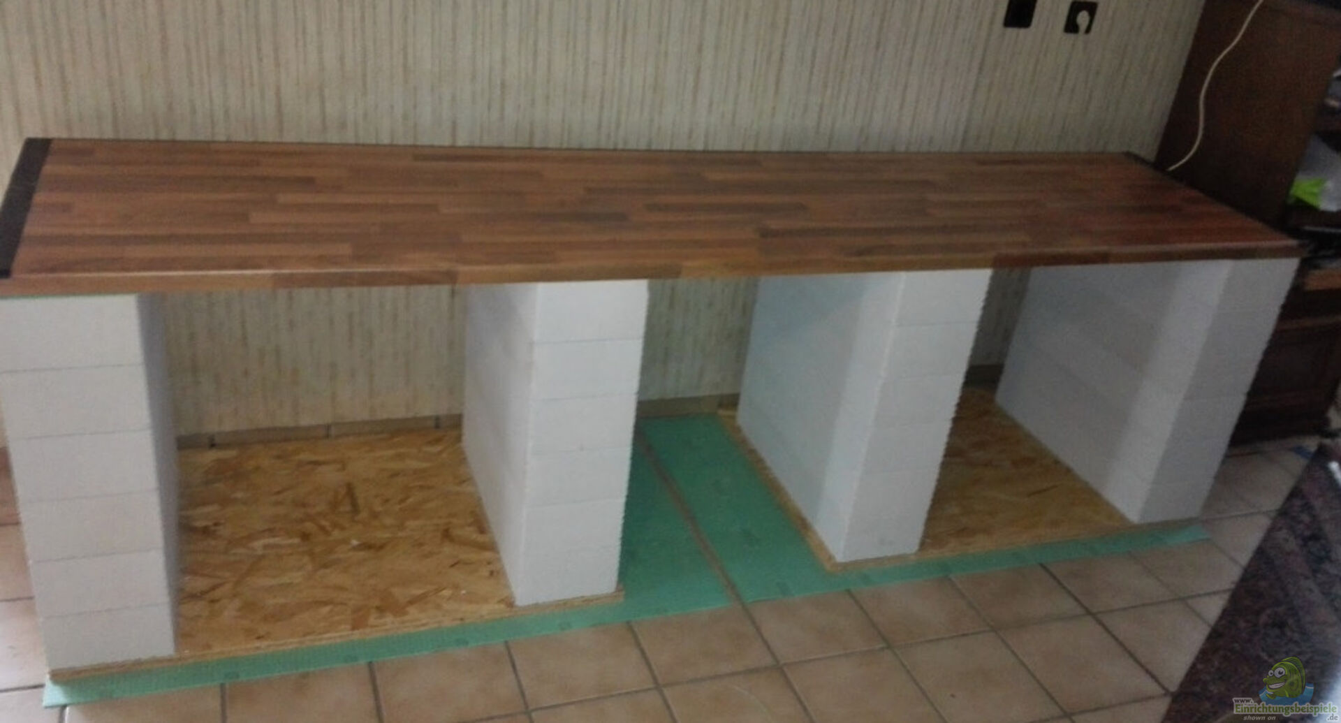 Selbstgebauter Unterbau aus 4 Ytong-Säulen, darauf eine 38mm Küchenarbeitsplatte (zusätzlich an der Wand verschraubt) und eine 7mm Moosgummimatte.