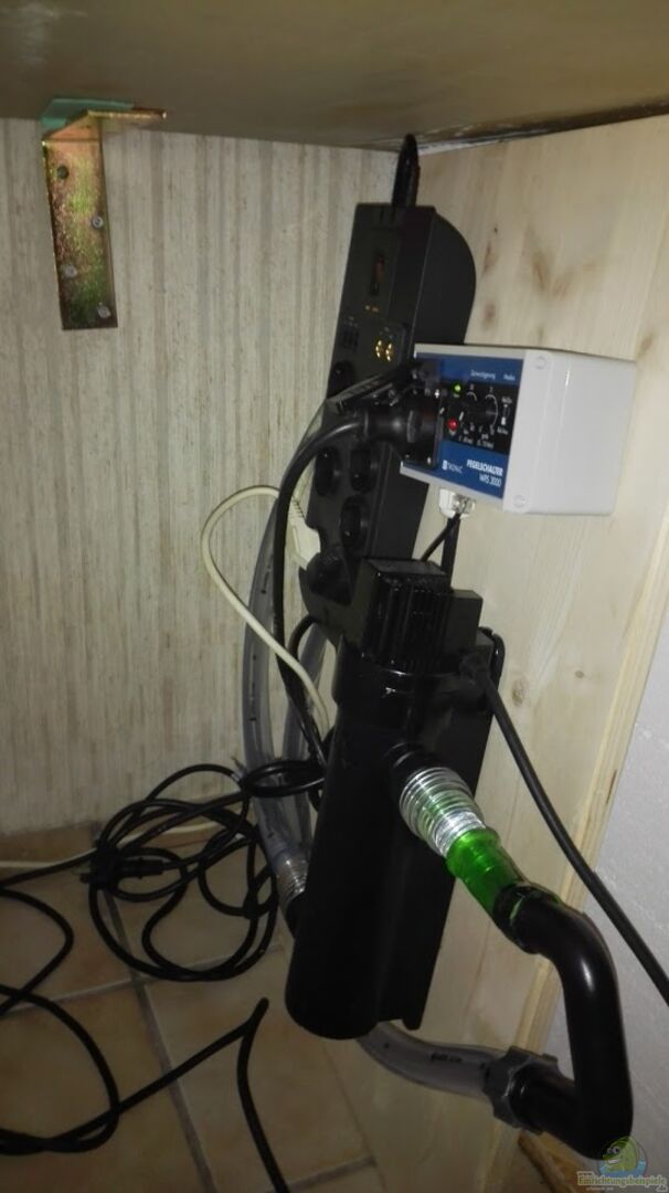 Ein 125 Liter Ex-Diskuswürfel wurde zu einem Filterbecken umgebaut. Gefiltert wird über blauen Filterschwamm (grob und fein), Sinterglasröhrchen und Korallenbruch. Rückförderung über 3000 l/h Tauchpumpe.