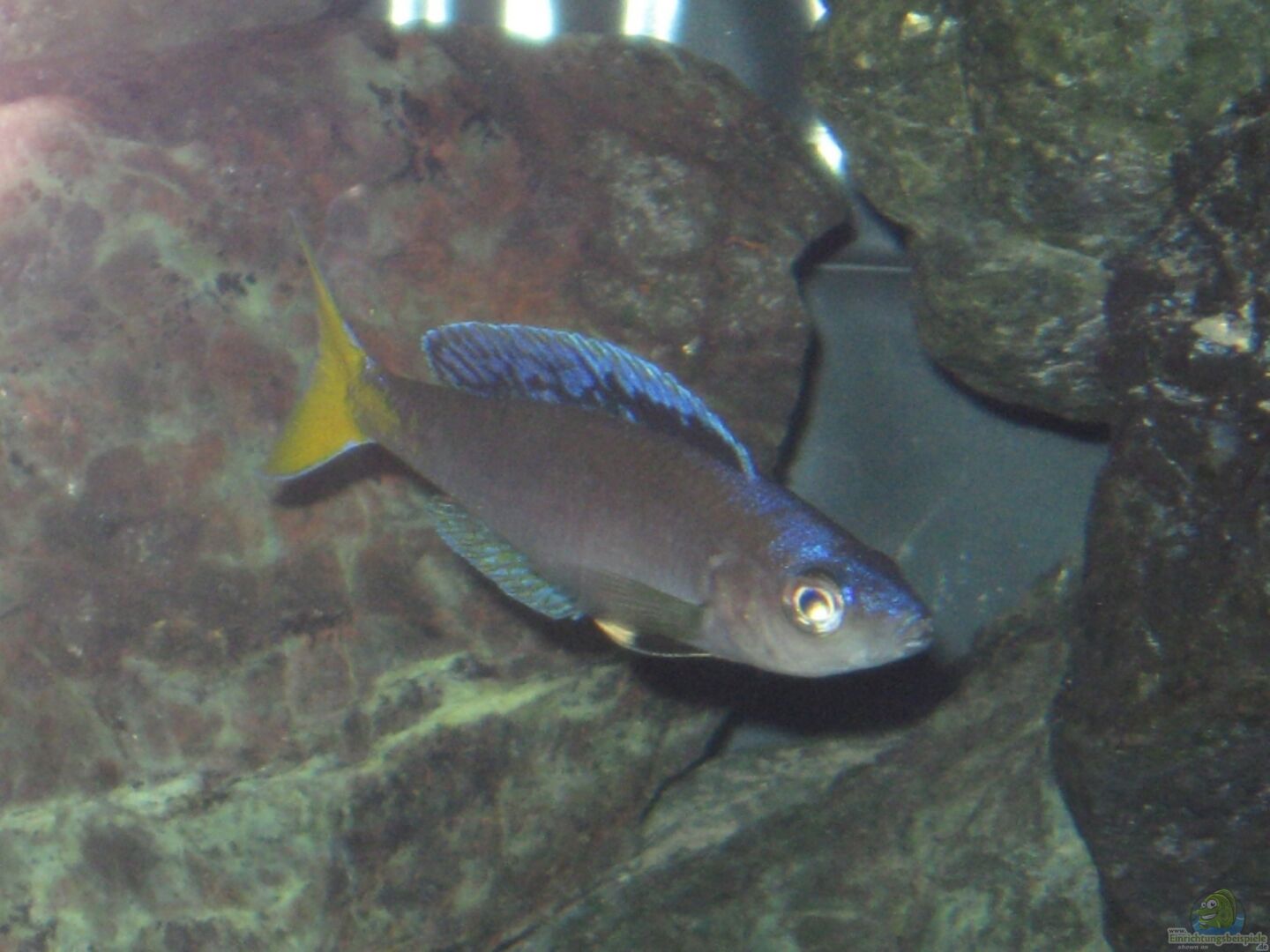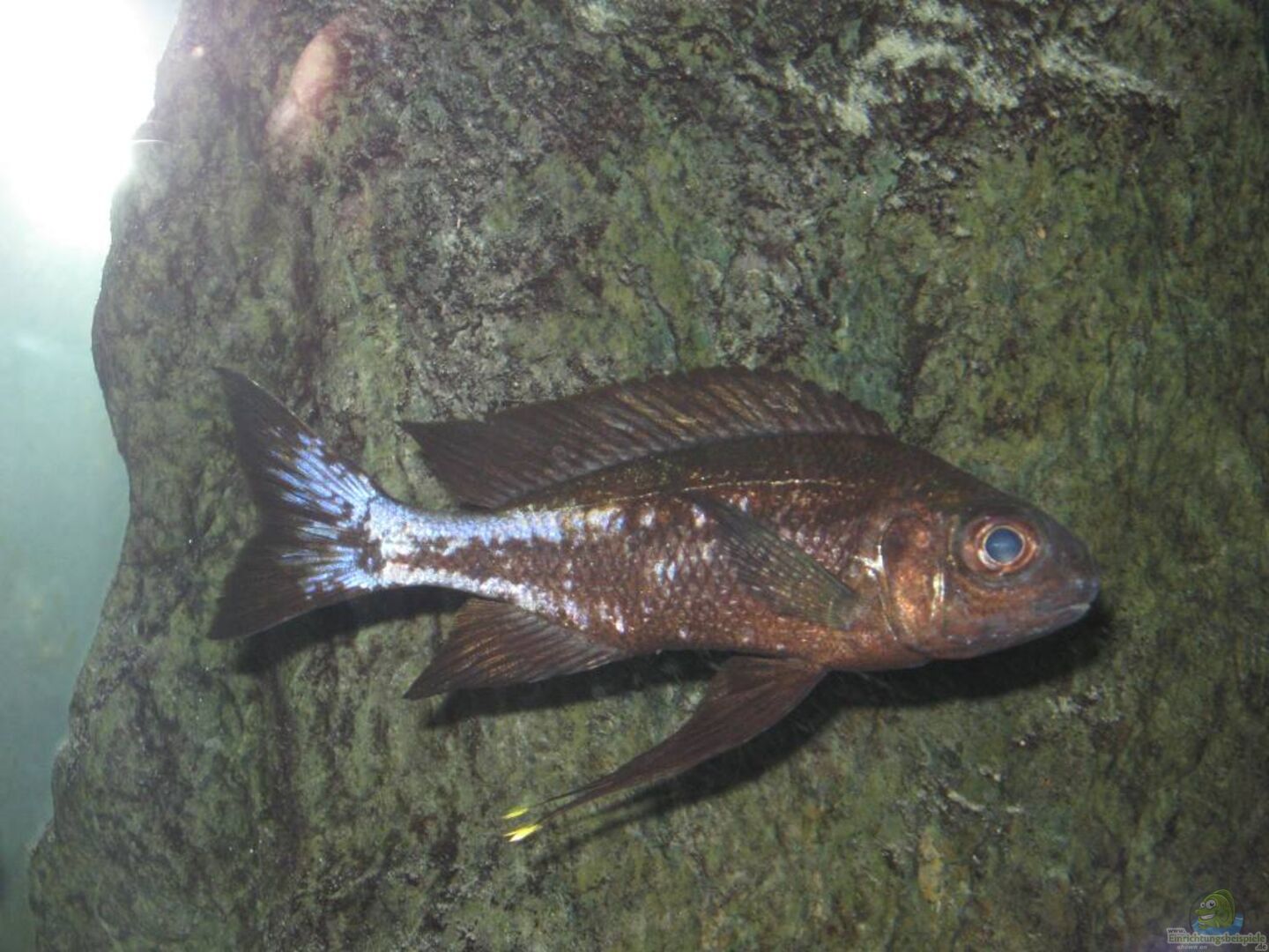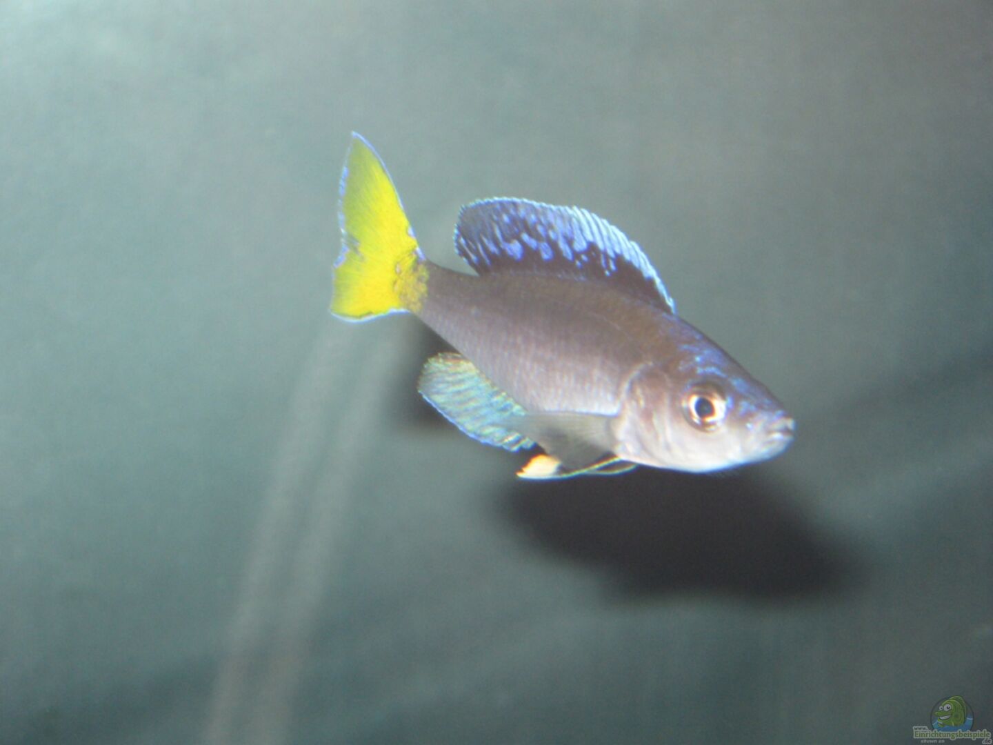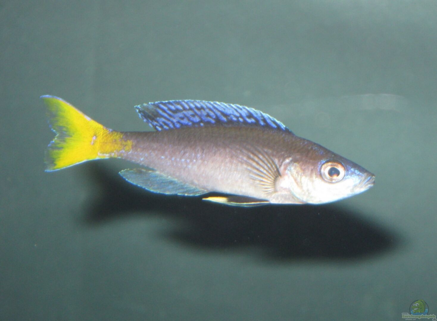 Kennzeichen: Die Art kommt in verschiedenen geografischen Farbrassen vor. Die Männchen erreichen eine Körperlänge von 15 Zentimetern und zeigen eine meist schwarzblaue oder braungraue Grundfärbung, teils mit gelblicher Tönung und einigen blauirisierenden Flecken in der Dorsale und Caudale. Die Rasse von den Inseln Nkondwe und Kerenge besitzen zusätzlich ein wei??blaues Farbmuster auf dem Schwanzstiel und der Caudale. Die graugelblichen Weibchen sind nur geringfügig kleiner. * 2