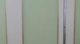 Fotorückwand einfach hinter das Becken geklemmt und von oben abgedichtet (P-Profil), so kann man sie mühelos auswechseln.