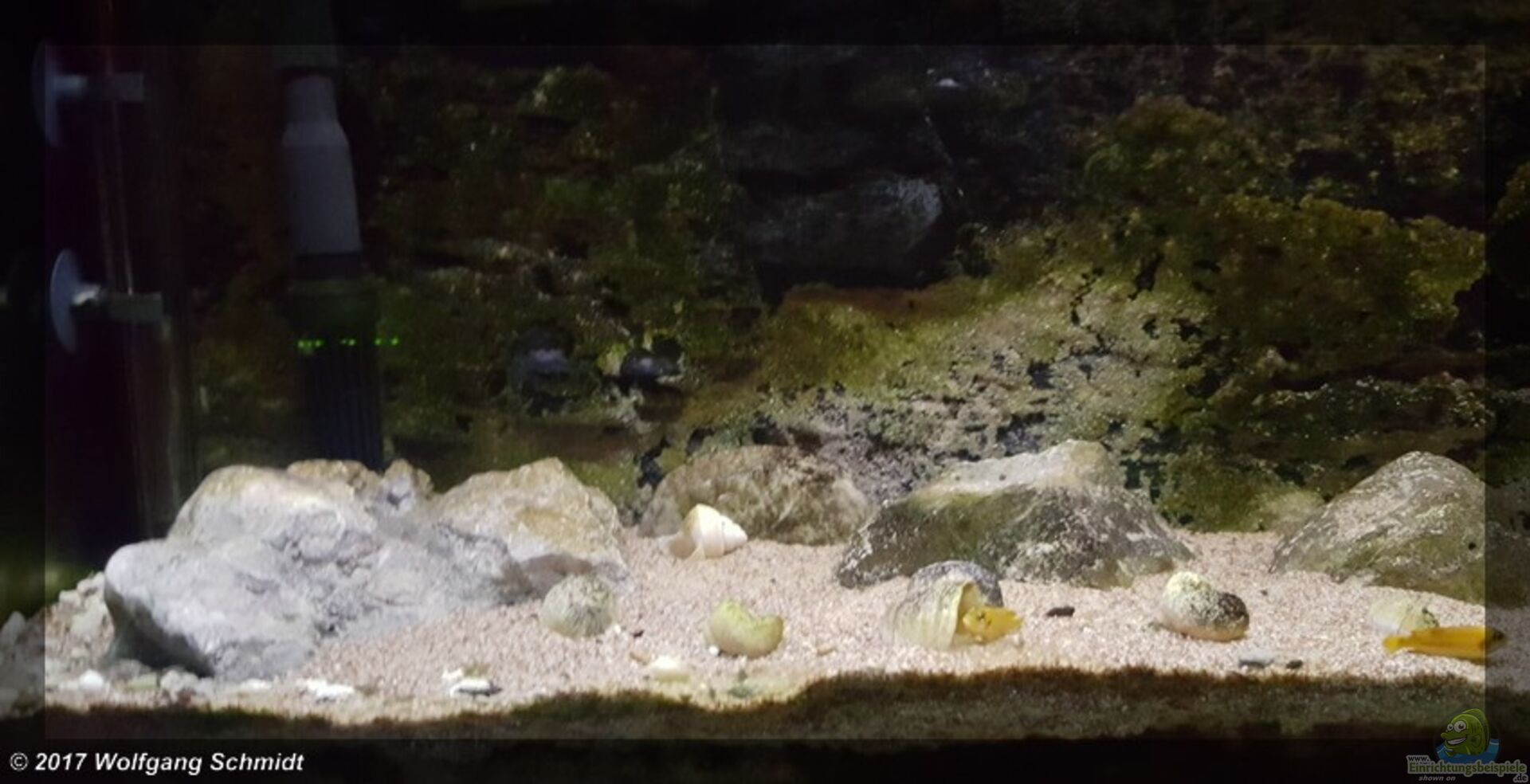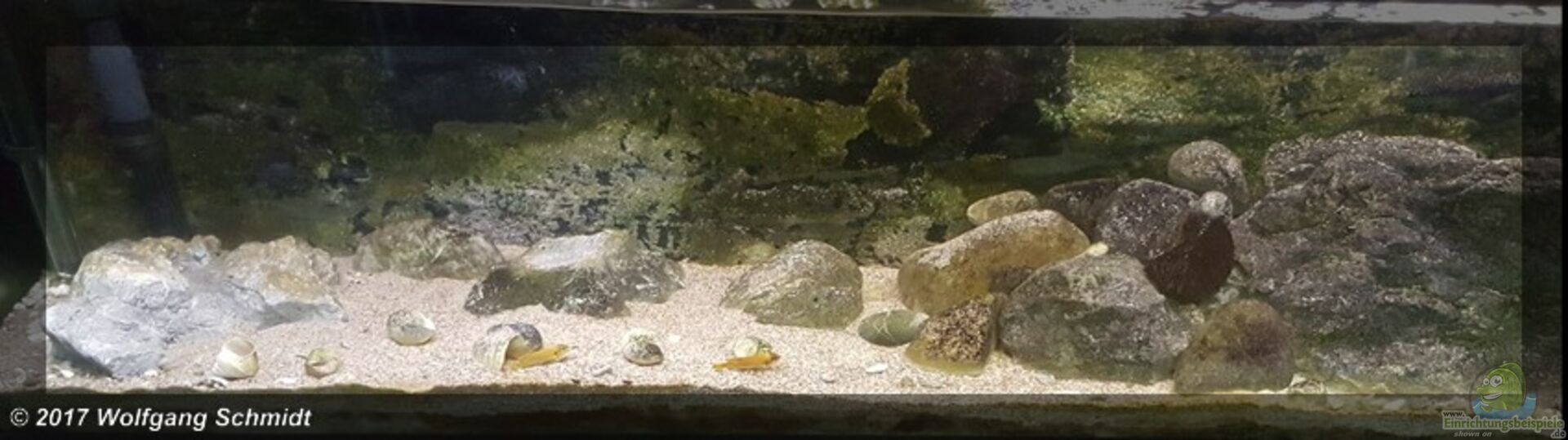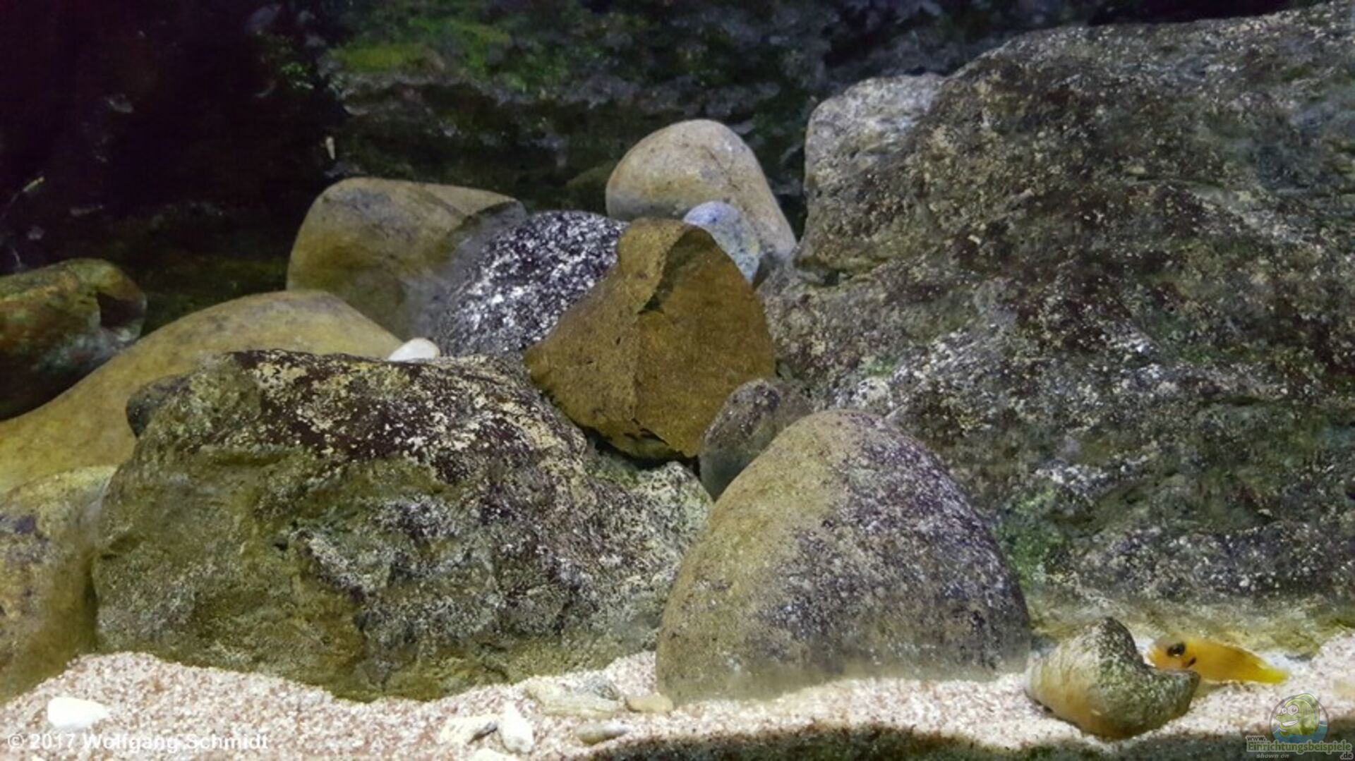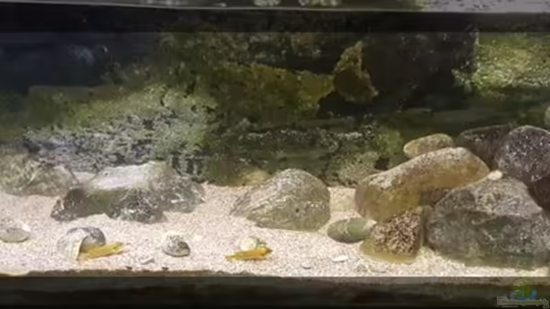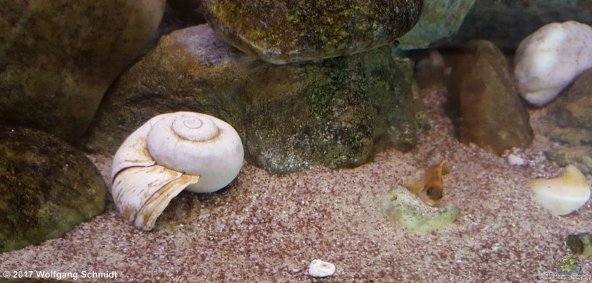 Im Becken befinden sich 10 importierte Schneckenhäuser aus dem Tanganjikasee (Neothauma tanganyicense) und ein importiertes Schneckenhaus aus dem Malawisee (Lanistes nyassanus).