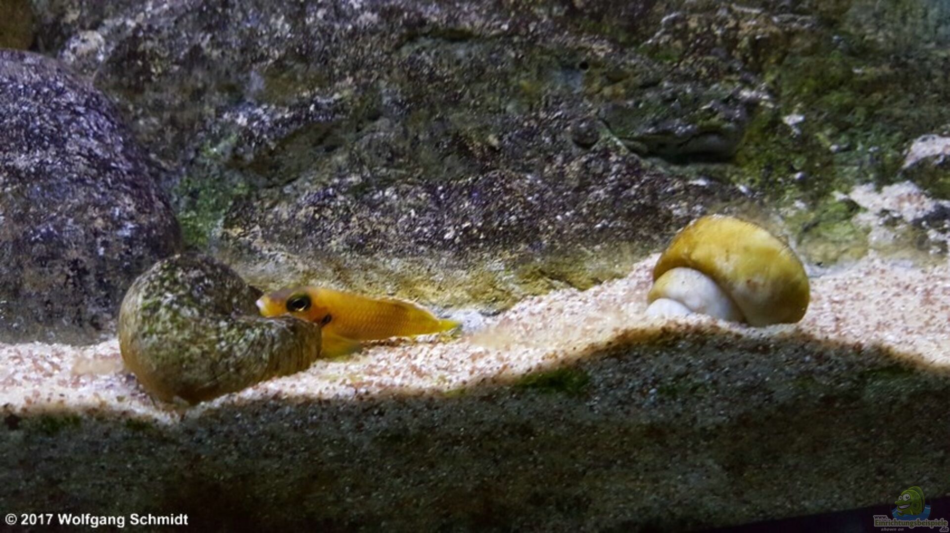 Lamprologus ocellatus "gold" ist ein kleiner Buntbarsch aus dem Tanganjikasee. Der Schneckenbuntbarsch bildet kleine Reviere, die er emsig verteidigt.