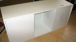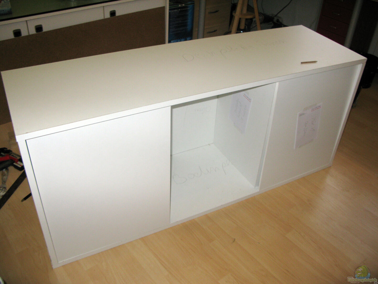 Der Unterschrank ist Eigenbau, beschichtete Spanplatte, dreiteilig mit zwei Schiebetüren und Regalböden.