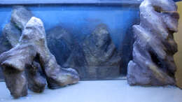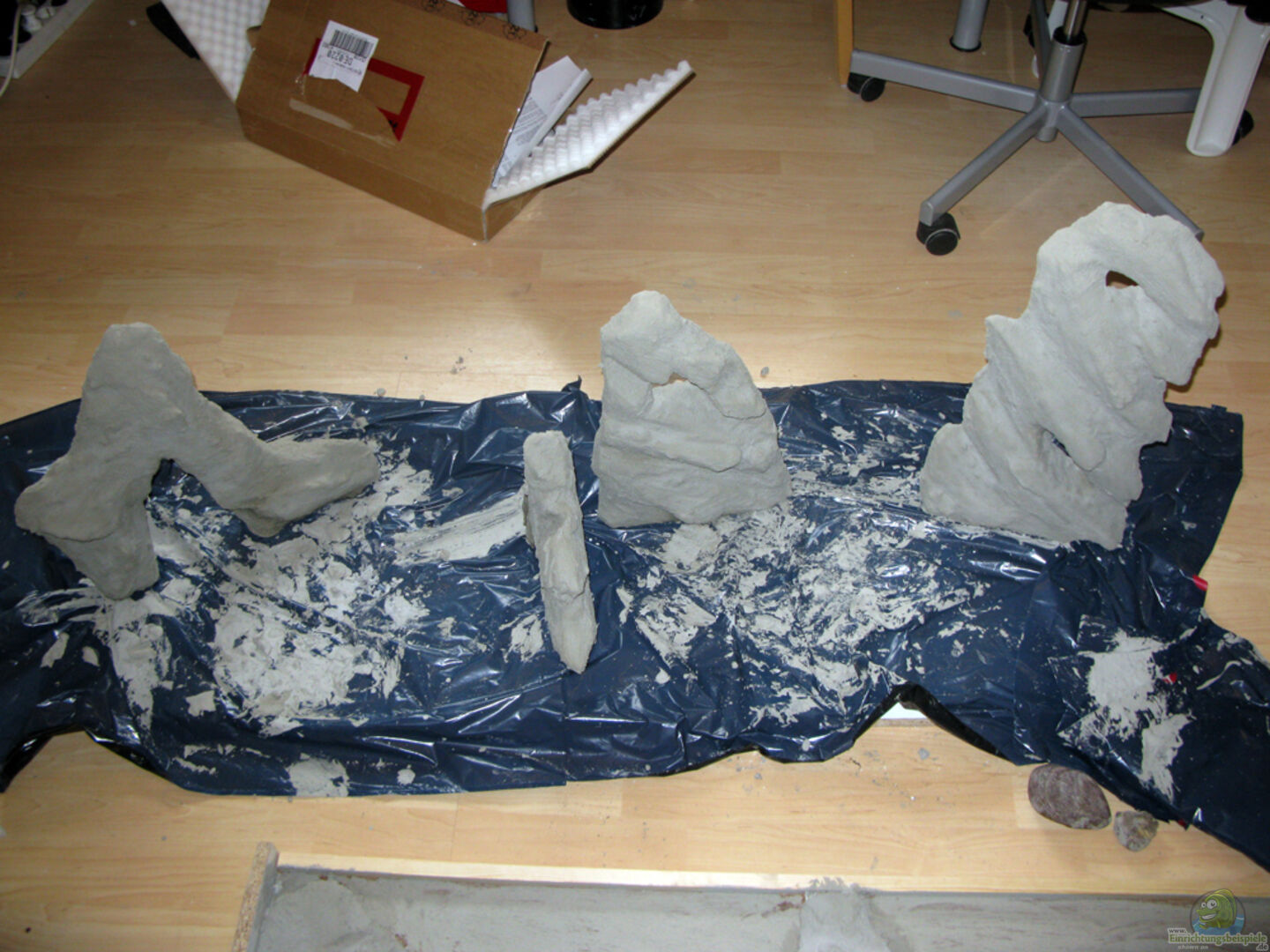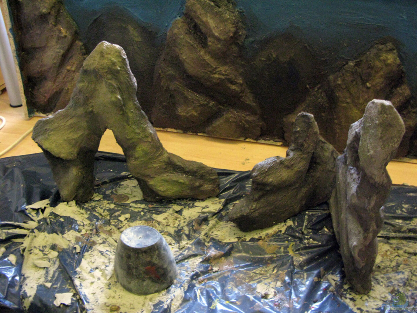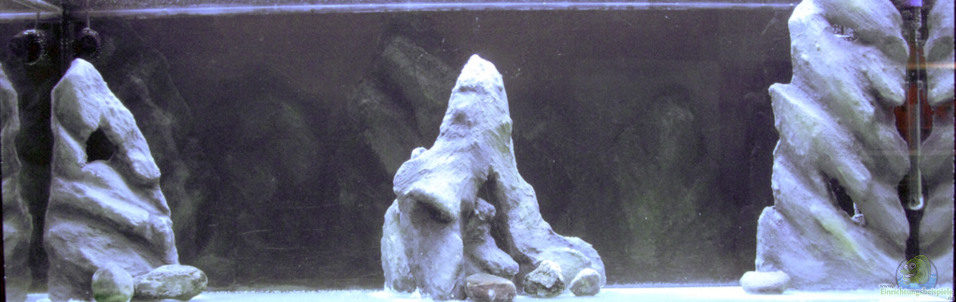 Die Module wurden mit Silikon auf dem Beckenboden verklebt und so angeordnet, das an den Seitenn die Technik verdeckt wird, und in der Mitte eine Revierbegrenzung mit Durchschwimmungsmöglichkeiten entstehen.