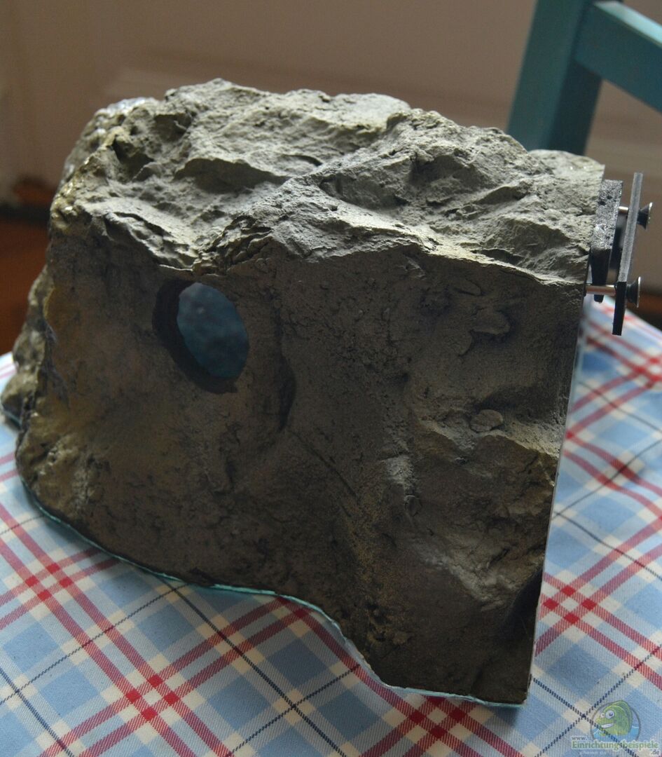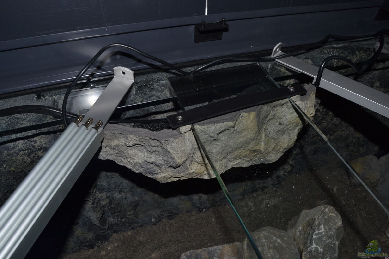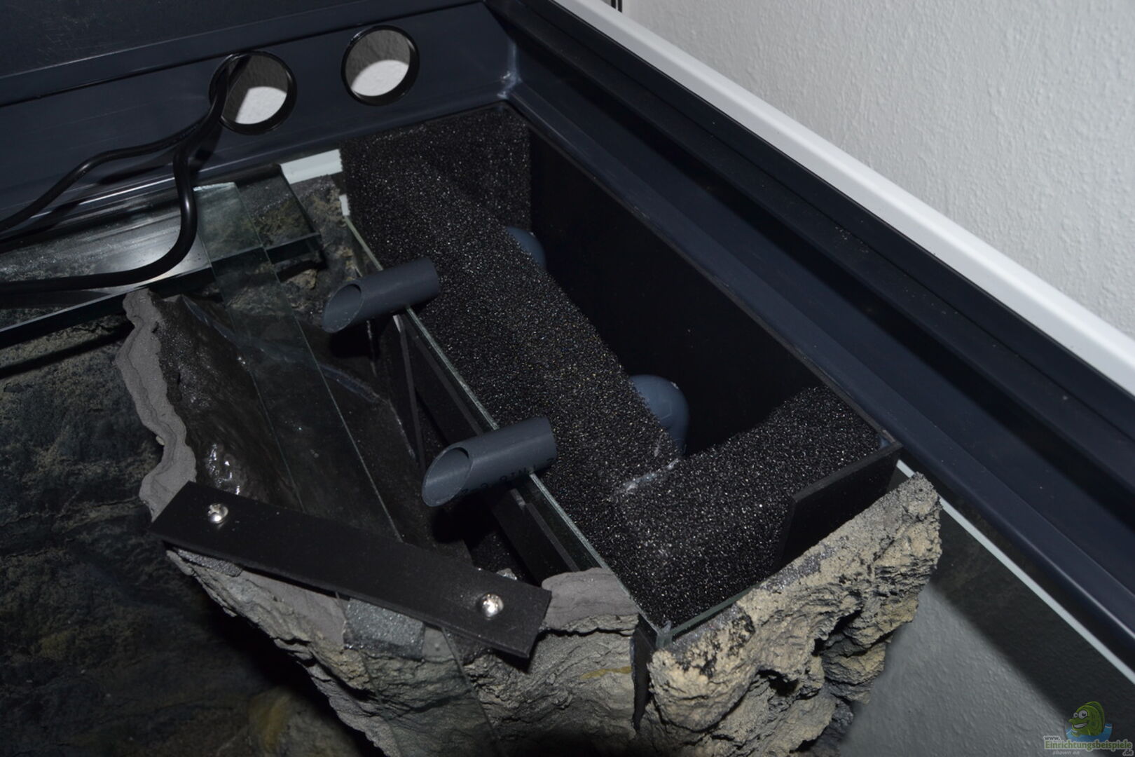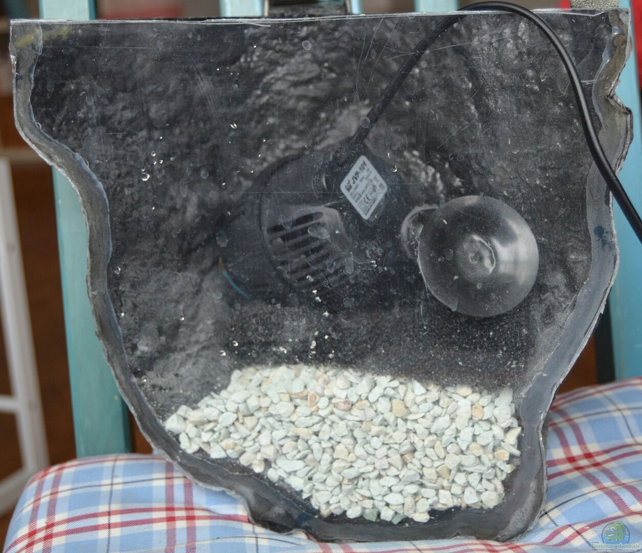 Der linke ??berhangfelsen ist an der Rückseite mit ein Plexiglasscheibe beklebt. Im Innern befindet sich eine Strömungspumpe vor dem seitlichen Au??strömloch und ein Zeolit-Bett über den beiden unteren Einströmlöchern.