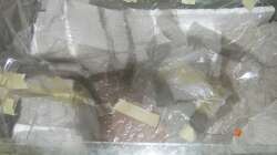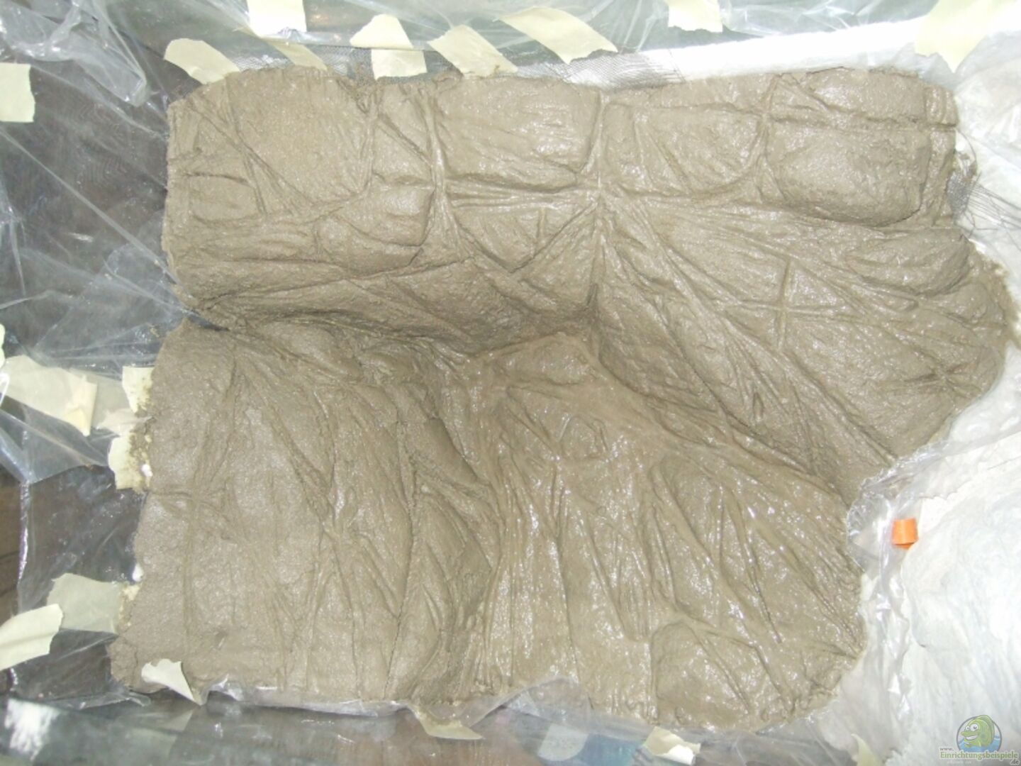 Selbstgebaute Felsrückwand aus Portlandzement bestehend aus drei Modulen, die ich mit brauner Abtönfarbe noch etwas abgedunkelt habe. Hinter dem Element ganz rechts versteckt sich der HMF. Das mittlere Element ist so gebaut, dass das Becken in zwei ungleich gro??e Reviere aufgeteilt wird.