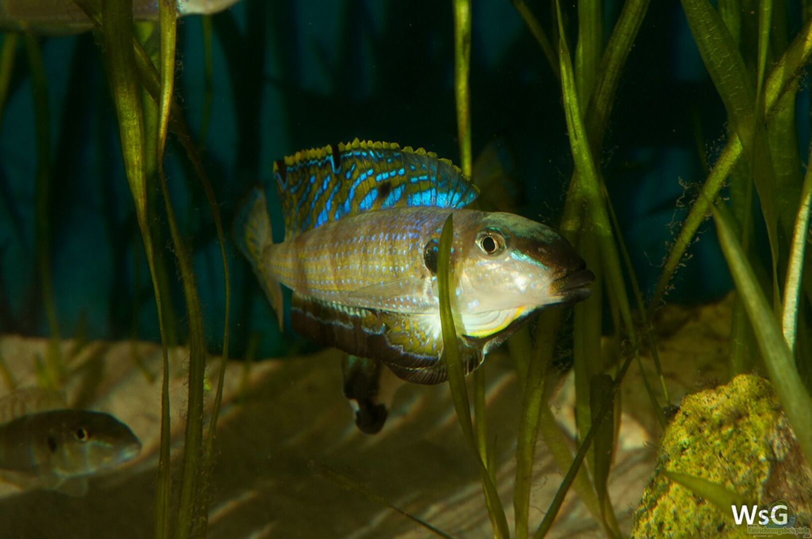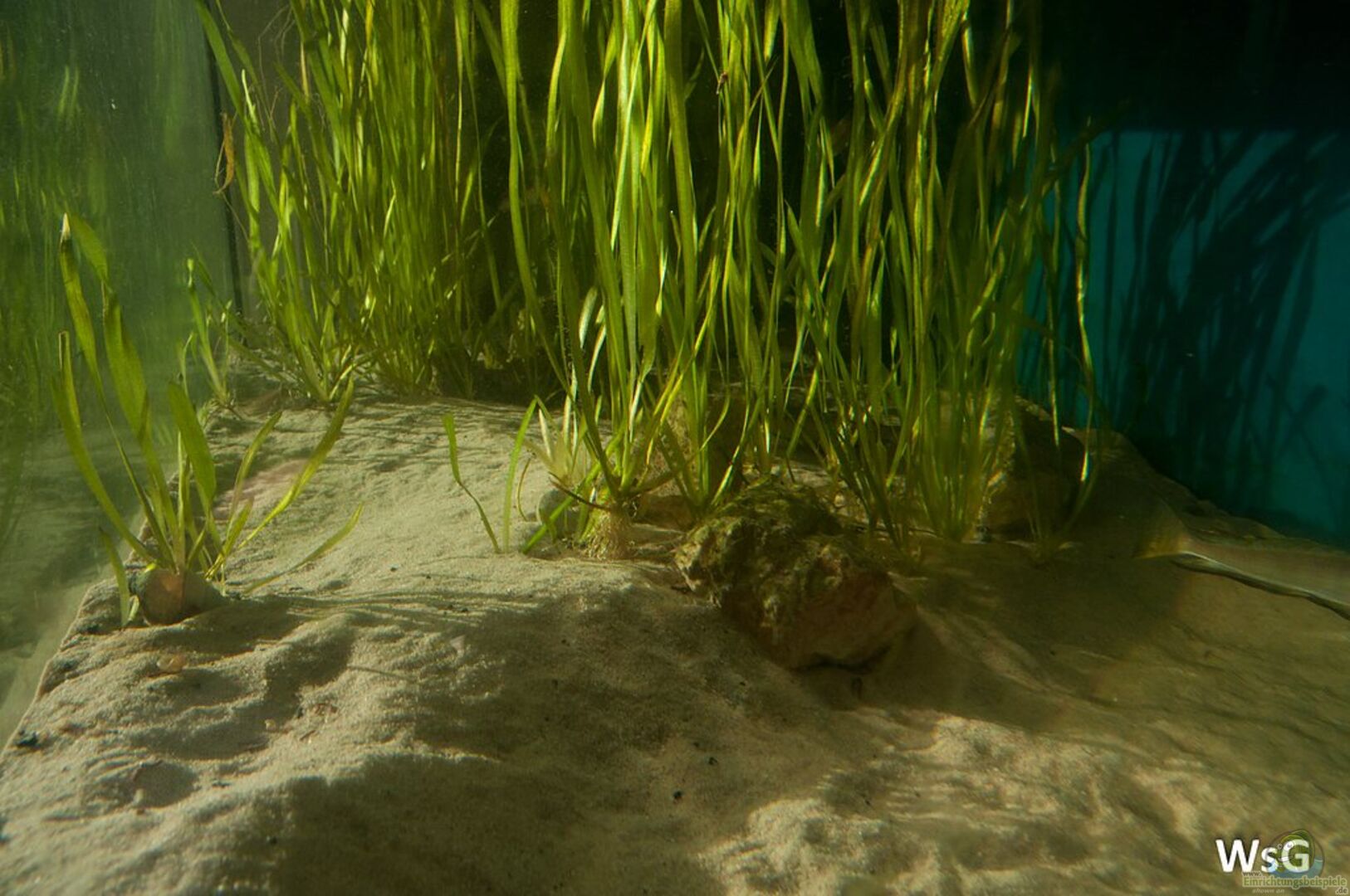 Gestein aus Kroatien als Revierbegrenzung, Rückwand tief blau gestrichen, Valisnerien an der Rückwand.