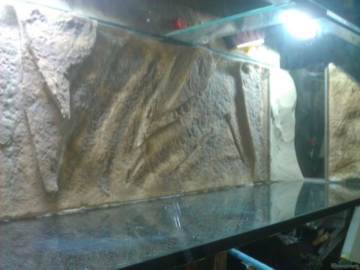 Selbstgemachte Rückwand aus Styrophor und Sand, verbunden mit Epoxid-Harz.