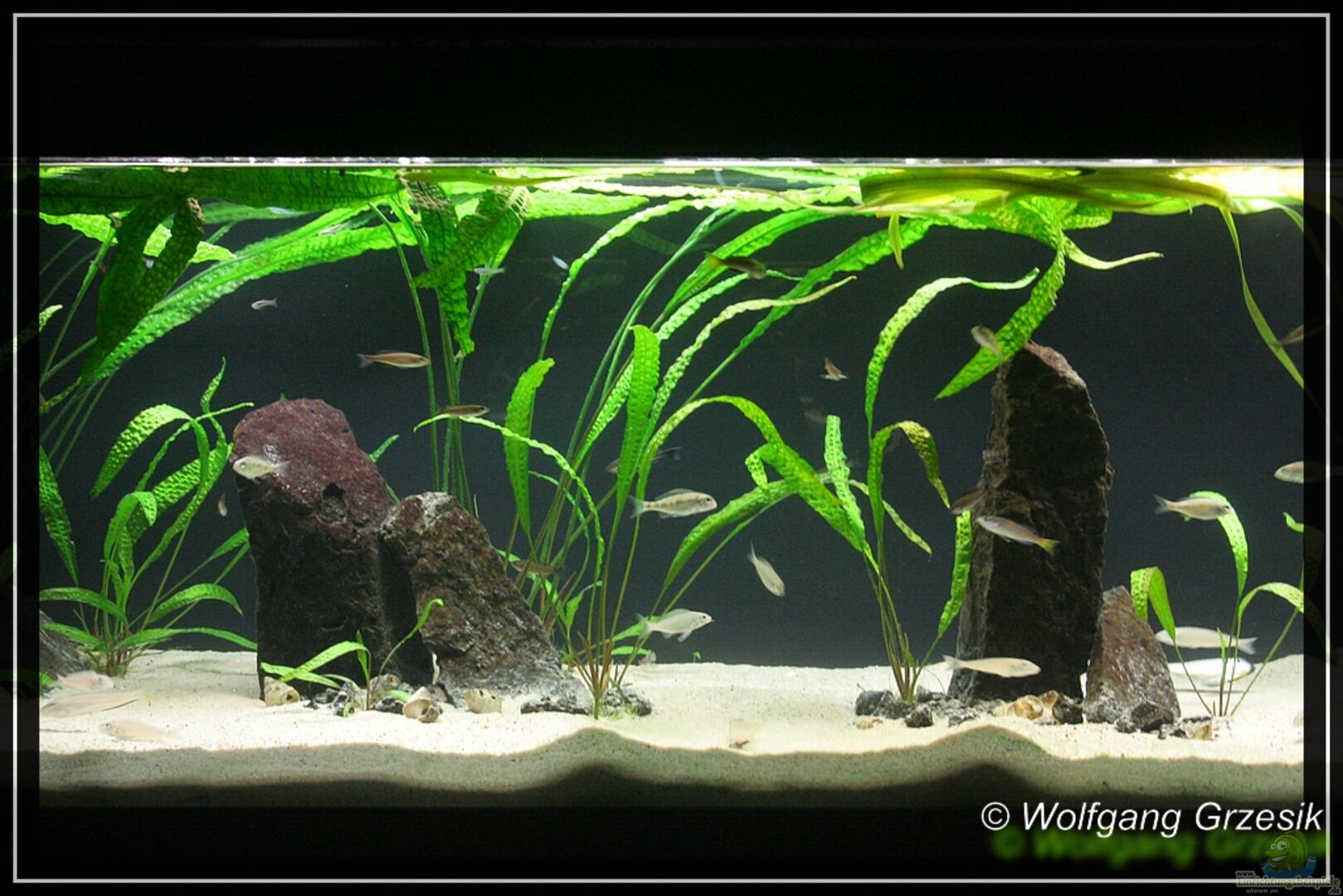 Da sich die Fische in der Natur in der Nähe gro??er, teils über und ineinander verschachtelter Felsen, teils auch an steil abfallensen Feldwänden aufhalten, sollten durch hochaufragende Steine bzw. Steinplatten Reviergrenzen aufgezeigt werden."