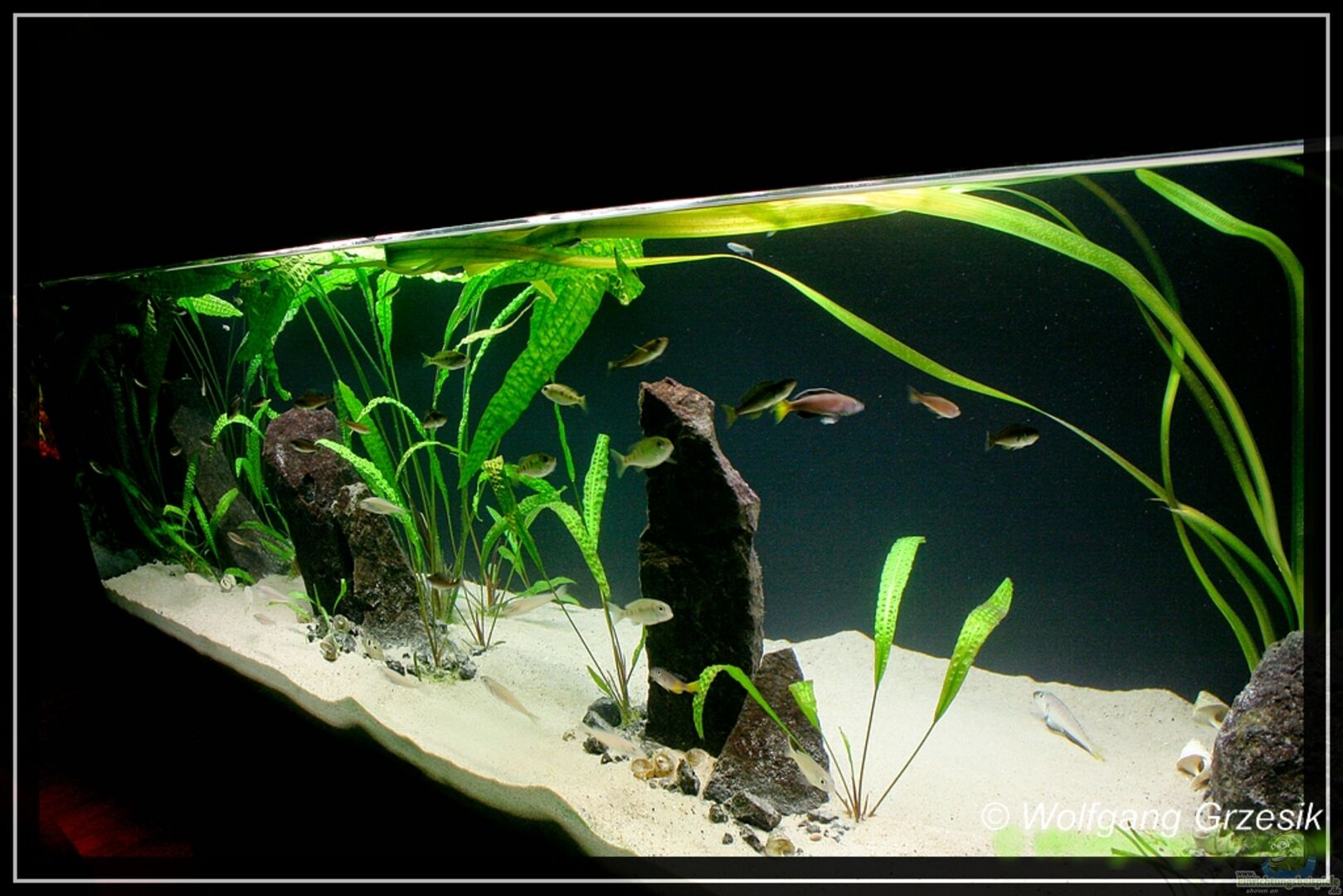 Das Becken wurde lange von mir geplant, da es mit dem ersten Versuch leider an einer Treppenstufe scheiterte, und ich das alte Becken wegen eines Risses in der Frontscheibe zerlegte. Ich habe mich um Details bemüht, soweit es das Internet hergab die Fischarten studiert.