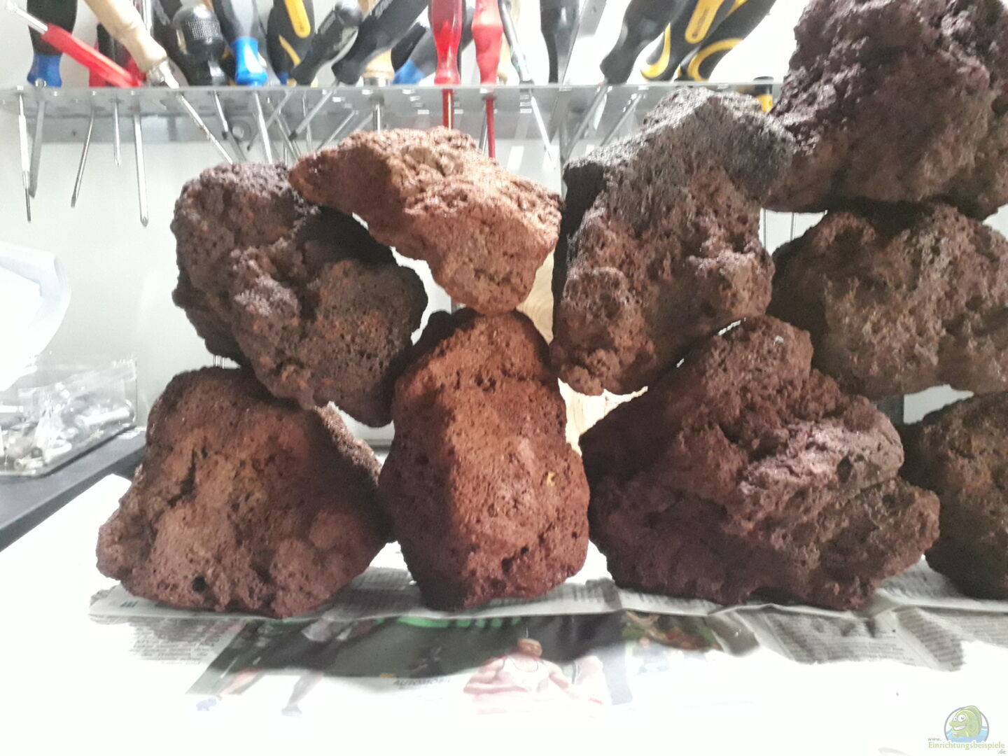 Mit dem Lavagestein habe ich vor dem Einsetzen eine Rückwand modelliert und anschlie??end mit Aquarien-Silikon verklebt. Die Rückwand besteht aus 3 einzelnen Abschnitten, welche nicht mit einander verklebt sind und im Aquarium einfach an einander geschoben werden. So kann man sie leichter ins und wieder aus dem Aquarium schaffen. Als zusätzlichen Schutz für den Aquariumboden (neben der Acrylplatte) dient eine zurechtgeschnittene, grobe Filtermatte, welche unter den Steinaufbauten platziert wurde. Dadurch sollte ein Glasbruch, durch eventuelle punktuelle Belastungen, vermeiden werden können.