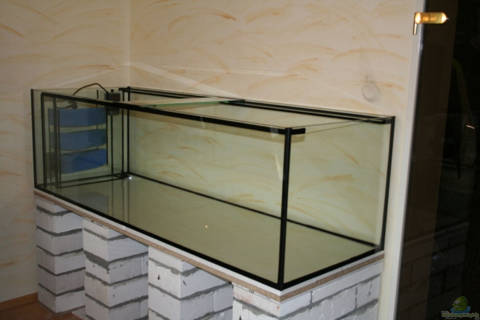 Sto??verklebtes 12 mm Glas; 2 Quer- und 1 Mittelstrebe; linksseitig eingeklebter Bio-Innenfilter; dahinter 25 mm Bodenbohrung mit PVC-Verrohrung und Kugelhahn zum Wasserwechsel; Unterschrank aus Ytong-Steinen gemauert: Solide und kostengünstig; Aufbau des Unterschranks vom Boden aus: 1 Lage Trittschallschutz (des Parketts wegen), 19 mm Spanplatte, Ytong-Steine, 10 mm Styropor, 22 mm Spanplatte, 20 mm Styropor, darauf der Tank !