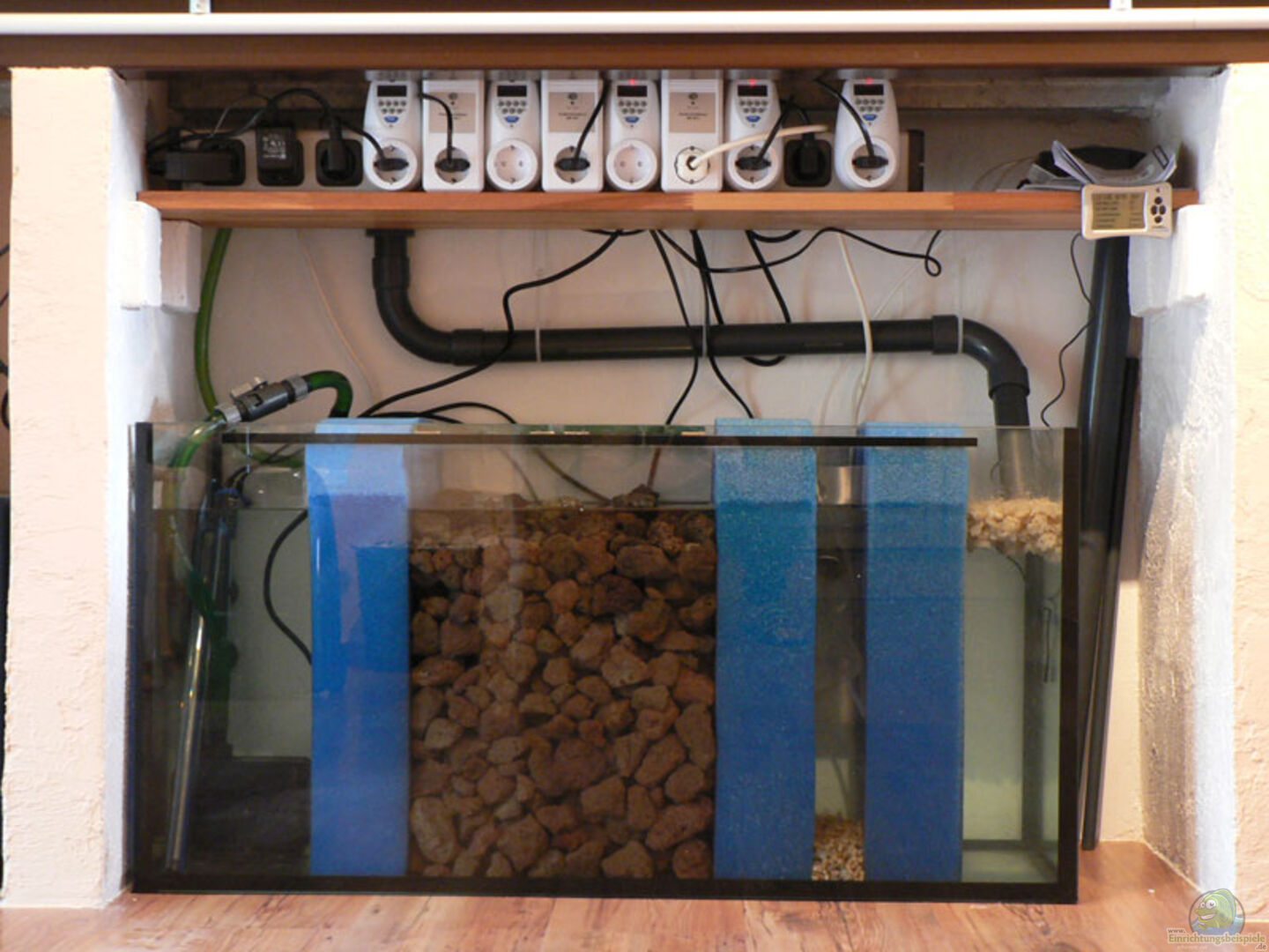 Das Becken selbst übernimmt ebenfalls Filteraufgaben, da der angesammelte Mulm in den Ecken und zwischen den Steinen bewu??t nicht (oder nur sehr selten) abgesaugt wird. Allerdings werden Ausscheidungen und Futterreste durch die Welse nachts "zerpflügt"
