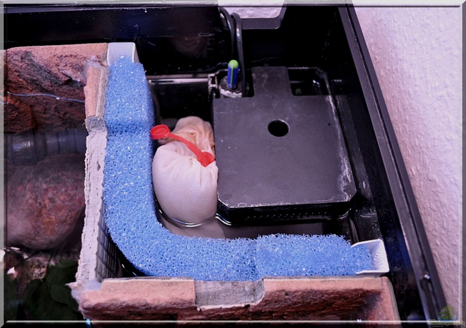 - um den Innenfilter herum einen HMF (grobe Filtermatte, 3cm) gebaut als zusätzliche biologische Filter-Fläche (15x15x45 cm = 1.012 cm2 Fläche)