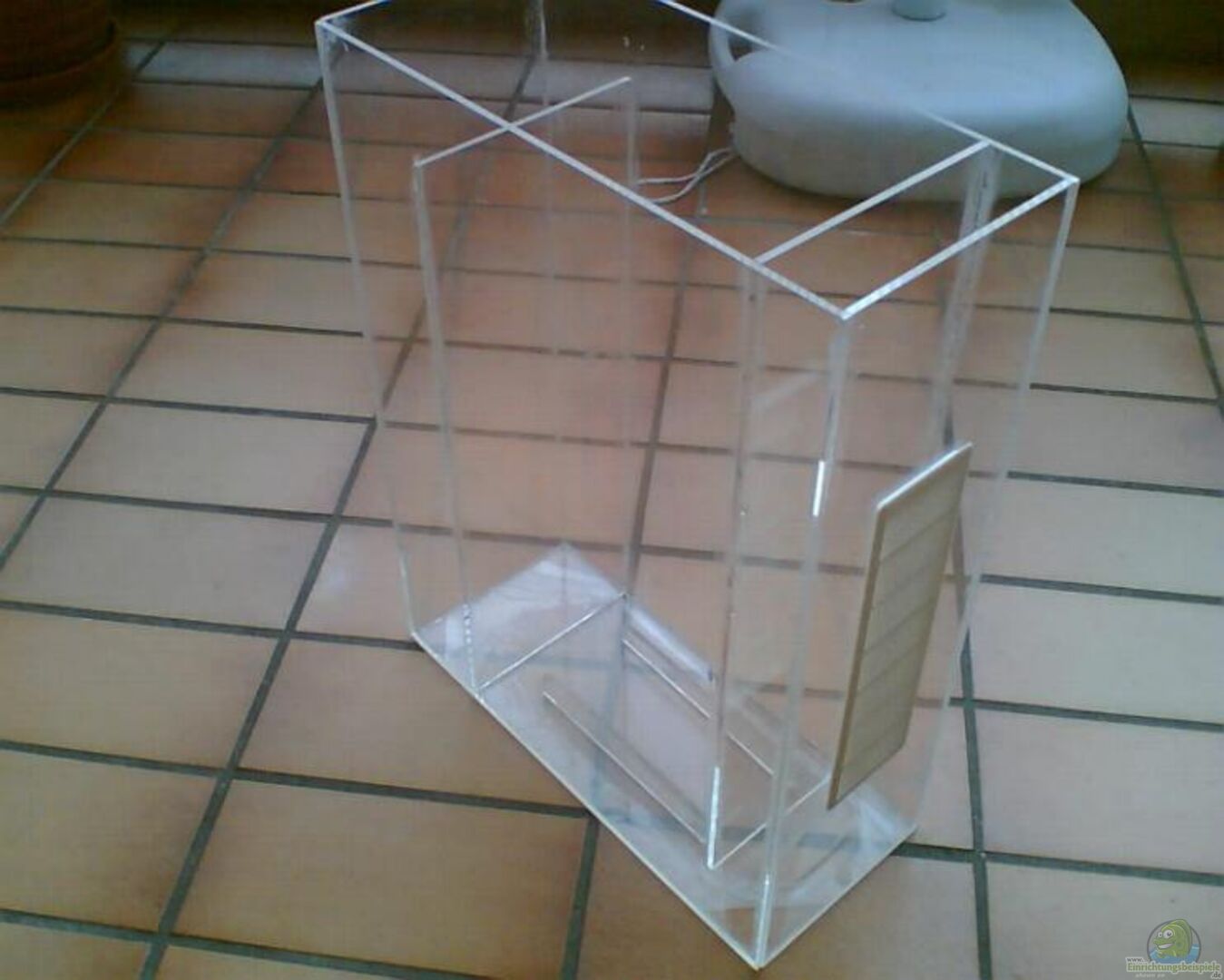 Biologische Filterung durch einen selbstgebauten Plexiglas 3-Kammer-Innenfilter mit 25 Litern Volumen. Als Filtermaterial dient blauer Filterschaumstoff, Filterwatte, Siporax und Ehfi Substrat. Betrieben wird das Ganze mit einer Eheim Compact 600, damit auch alles recht langsam durchflossen wird.
