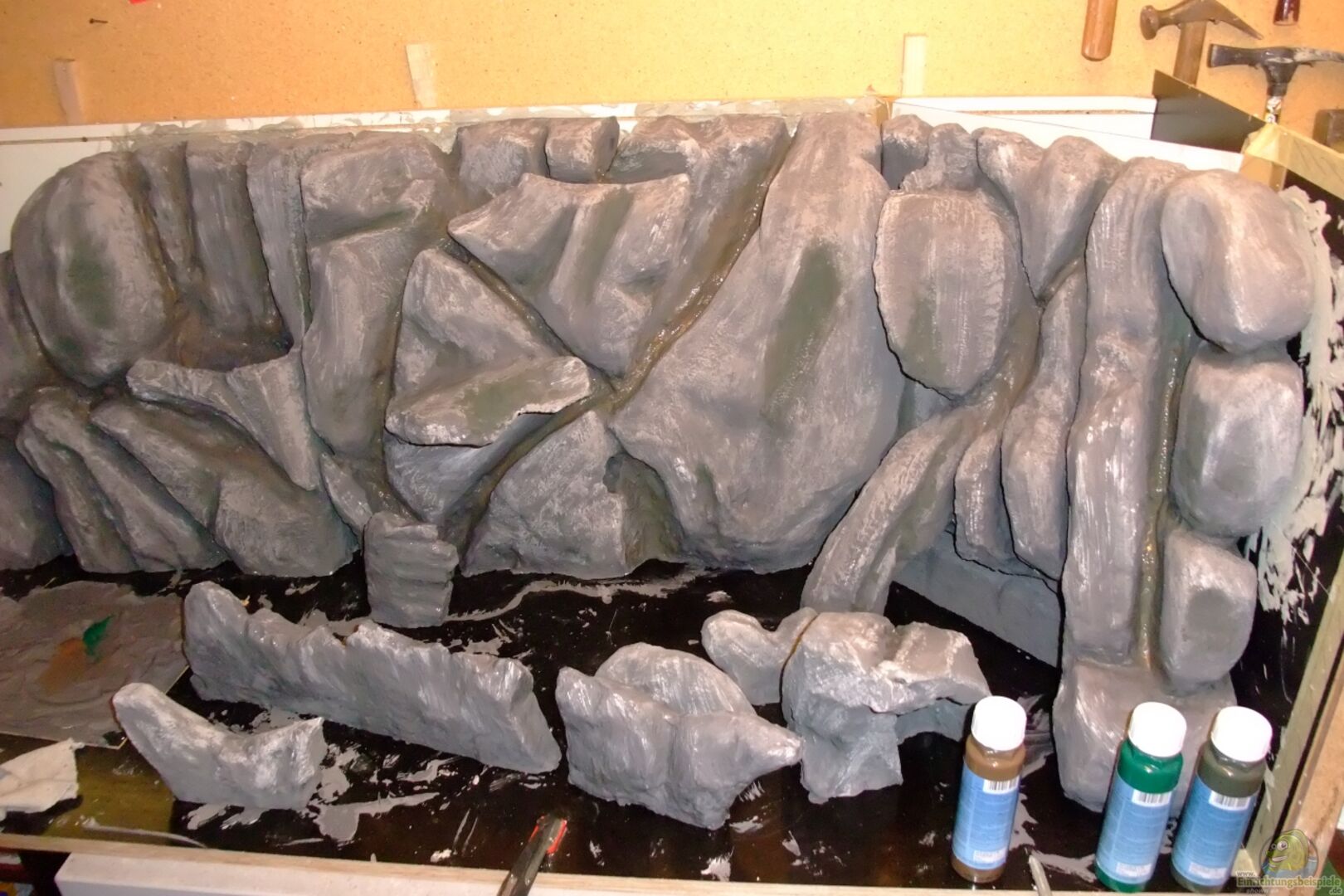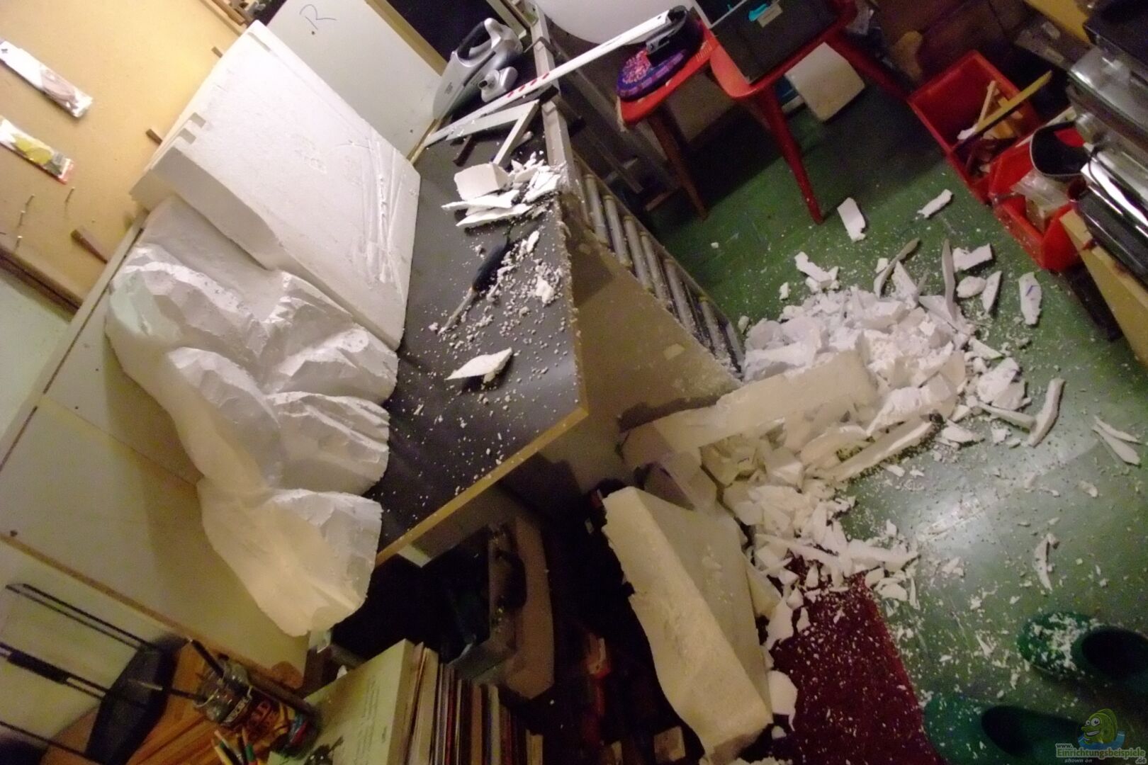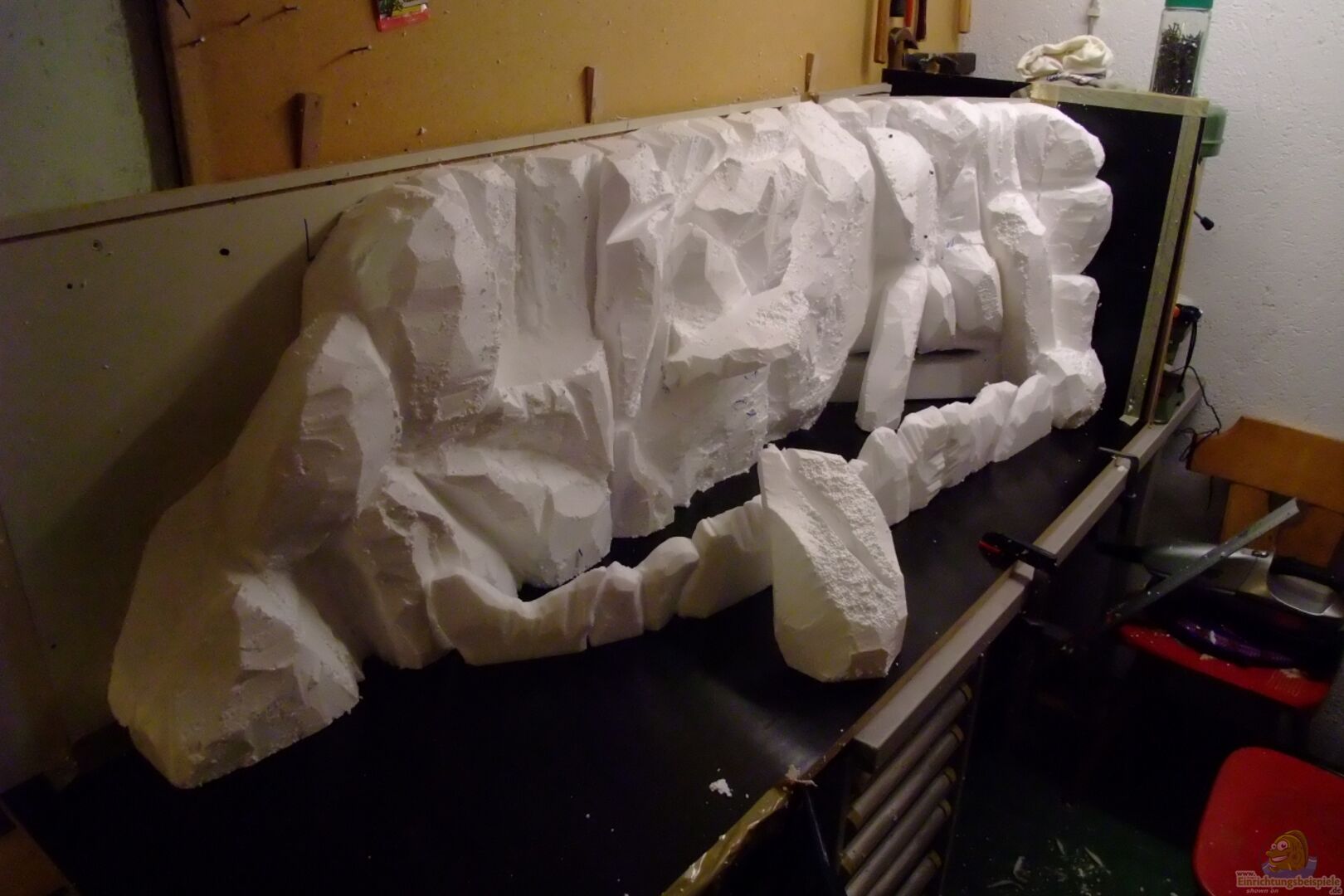 Die Styroporplatten wurden mit Cuttermesser und Hei??luftfön in Form gebracht und an das Aquarium angepasst, auch Höhlen und ??berstände wurden mit eingeplant. Als nächster Schritt wurde alles mit Zement überzogen und zum austrocknen stehen gelassen (das ganze Szenario 2x).