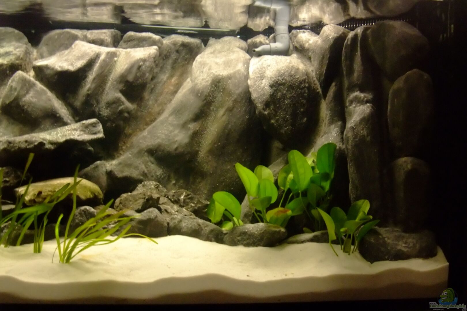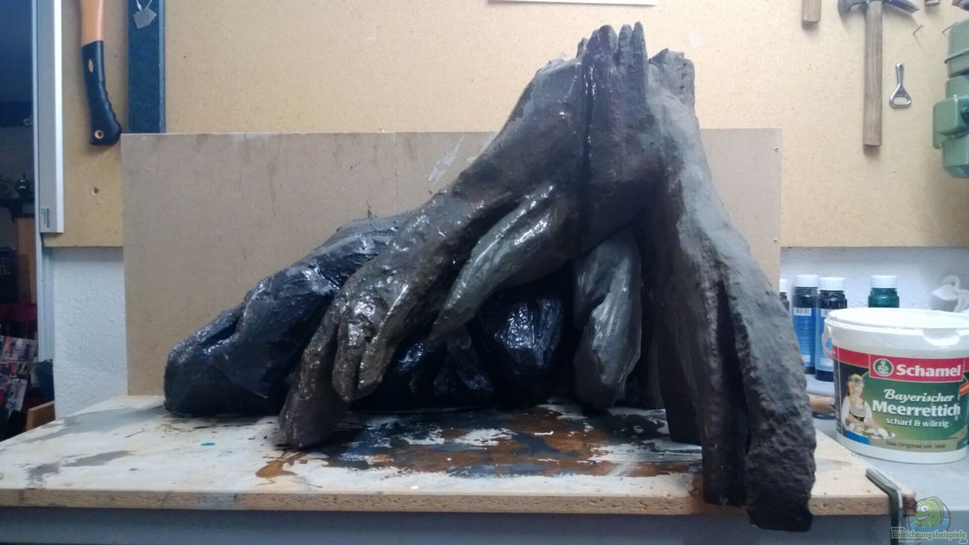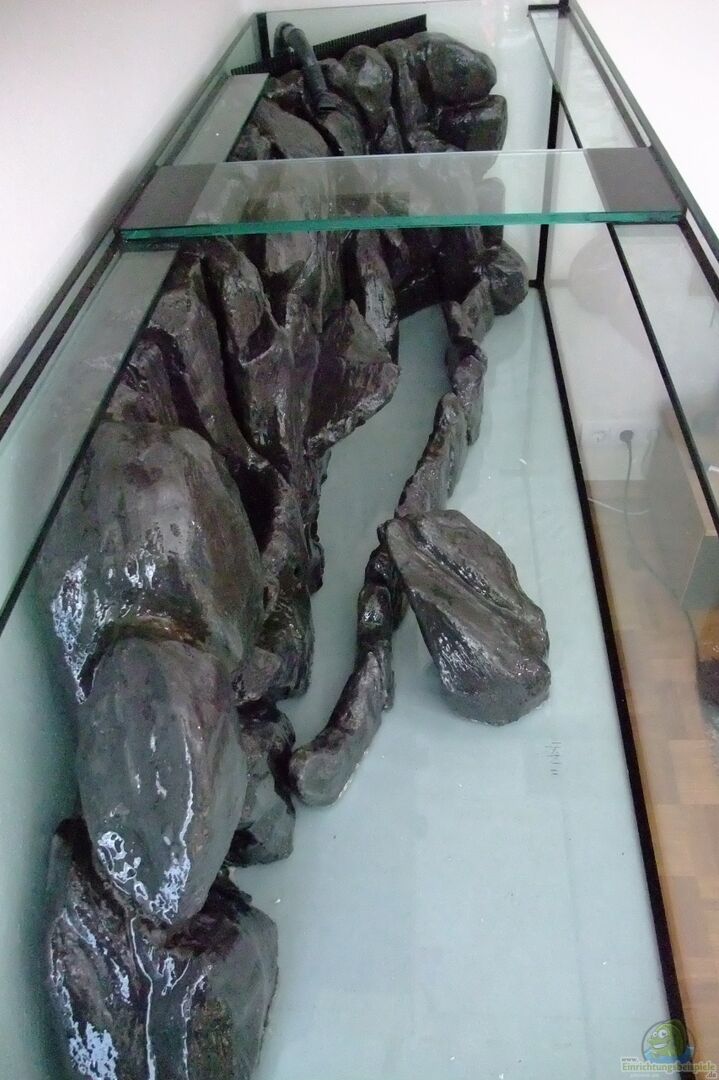 Die Styroporplatten wurden mit Cuttermesser und Hei??luftfön in Form gebracht und an das Aquarium angepasst, auch Höhlen und ??berstände wurden mit eingeplant. Als nächster Schritt wurde alles mit Zement überzogen und zum austrocknen stehen gelassen (das ganze Szenario 2x).