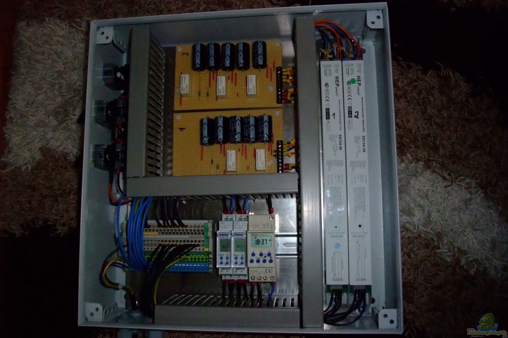 Selbstgebaute Dimmersteuerung (im Schaltschrank) für Sonnenauf- und Untergang Simulation. Auch Wolken können simuliert werden.