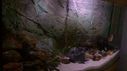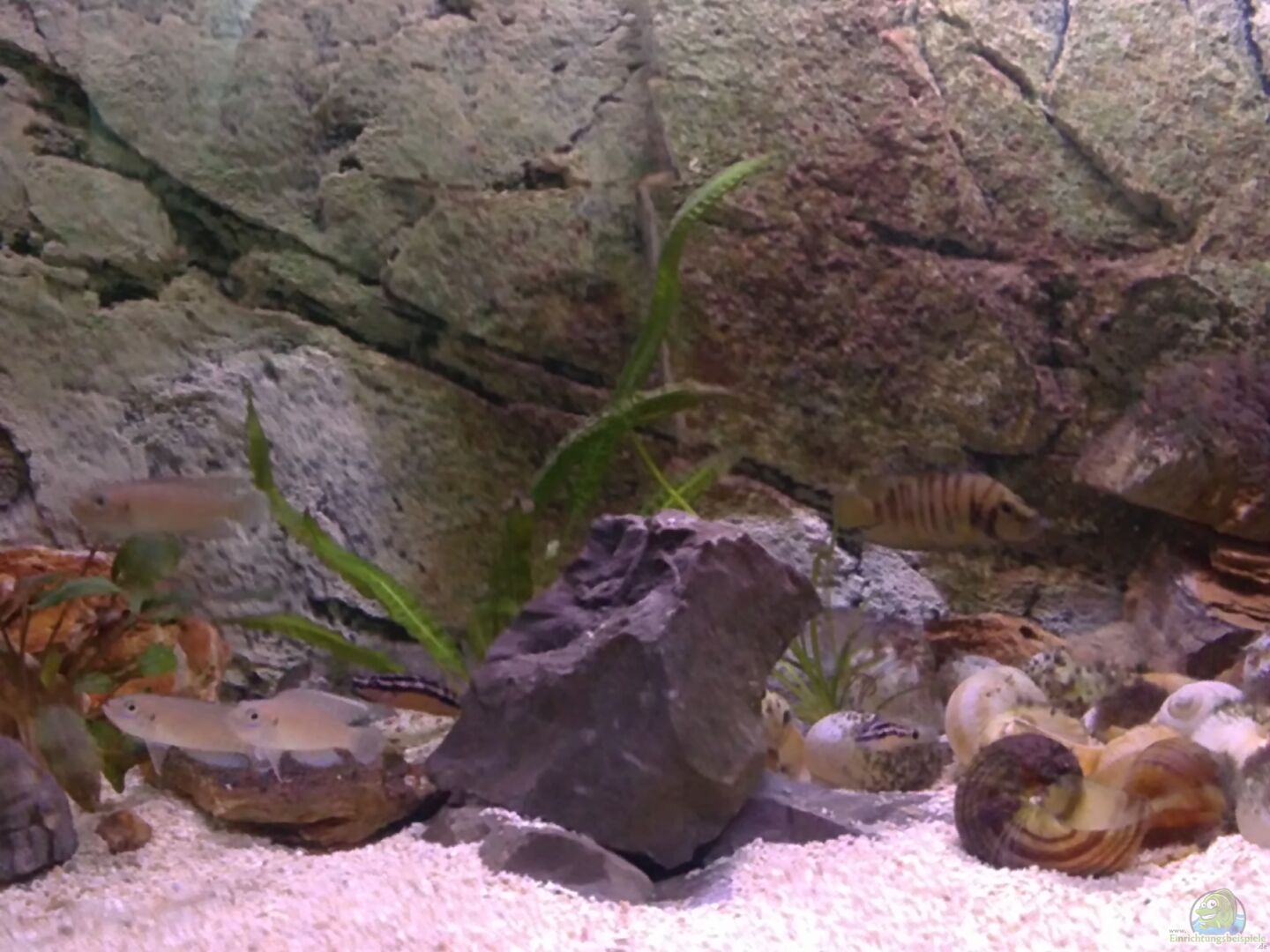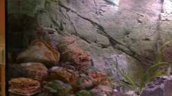 Pflanzen habe ich die Alten wieder eingesetzt.Kommt im Tanganjikasee ja sowieso nur selten oder in der Uferregion vor.Dienen also eigentlich nur zu optischen Zwecken.Der Heitzstab und das Ansaugrohr des Filters wurden hinter einem (mit Aquariensilikon)eingeklebten stück Rückwand versteckt, damit es nicht so im Gesamtbild stört.Wird au??erdem ab und an auch mal als Versteck genutzt.Der Filter wurde auf etwas über die Hälfte der Leistung gedrosselt.Mir wurde gesagt, da?? ein etwas langsamerer Wasserdurchflu?? besser für die Filterbakterien ist.Der Ausströmer ist so possitioniert, da?? er die Wasseroberfläche gut in Bewegung hält.Links und rechts im Becken habe ich noch einen Diffuser in das Gestein eingebaut.Diese dienen auch zu optischen Zwecken aber auch um Sauerstoff ins Wasser zu bringen(CO2 aus dem Wasser zu treiben und es auf zu härten).