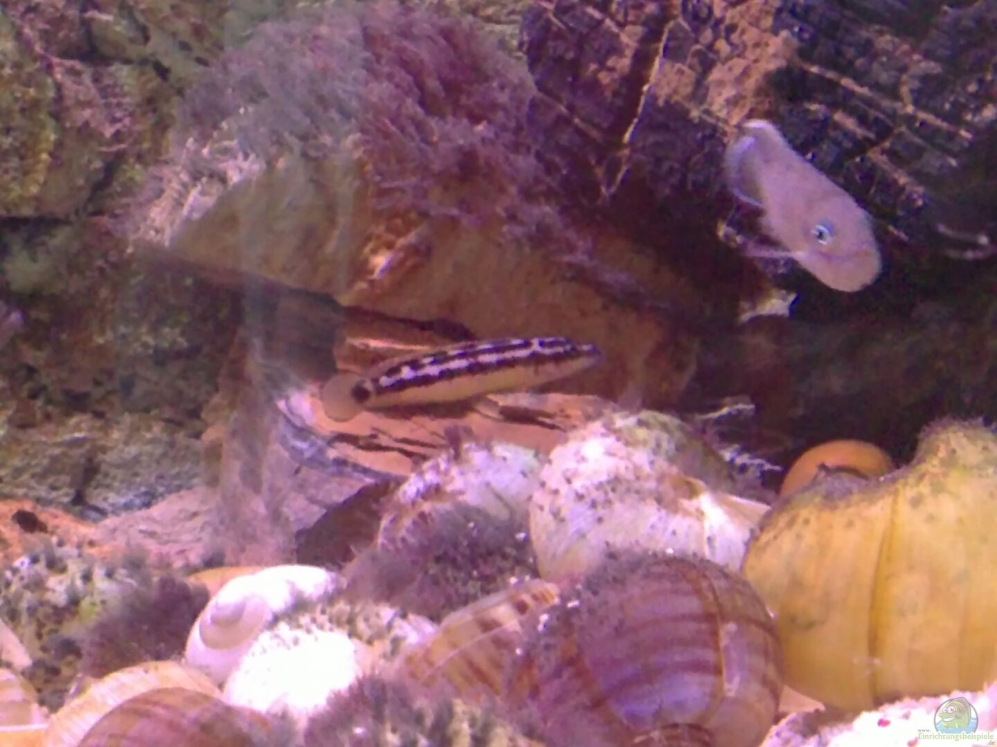 Habe zuerst die Steine(Felsen)ins Becken auf die erwähnte Plexiglasplatte gelegt, um einen Glasbruch zu vermeiden.Da meine Schneckenbuntbarsche ja doch sehr gerne buddeln und unter Umständen das Gestein untergraben und zum Einsturz bringen könnten.Danach wurde dann der Korallensand nach und nach eingefüllt und das Gestein dementsprechend erweitert oder gestapelt(Puzzle lässt grü??en).Durch diese Vorgehensweise konnte ich auch teilweise Höhlen und Verstecke unter dem Sand gestalten.Diese werden jetzt auch rege von den J.transcriptus genutzt.Im Gegensatz zur vorherigen Einrichtung habe ich jetzt auf beiden Seiten des Beckens Gestein aufgetürmt um genügend Versteckmöglichkeiten anzubieten.In der Mitte habe ich dann auch noch eine kleine Felsengruppe(mit Versteckmöglichkeiten unter dem Sand)aufgebaut um den Tieren eine Revierabgrenzung zu bieten.Rechts daneben habe ich dann einen Schneckenfriedhof angelegt um meinen Schneckenbuntbarschen ein Zuhause zu geben.Mein Ziel war es genügend Verstecke und Reviere anzubieten.Hoffe das ist mir ein bisschen gelungen.