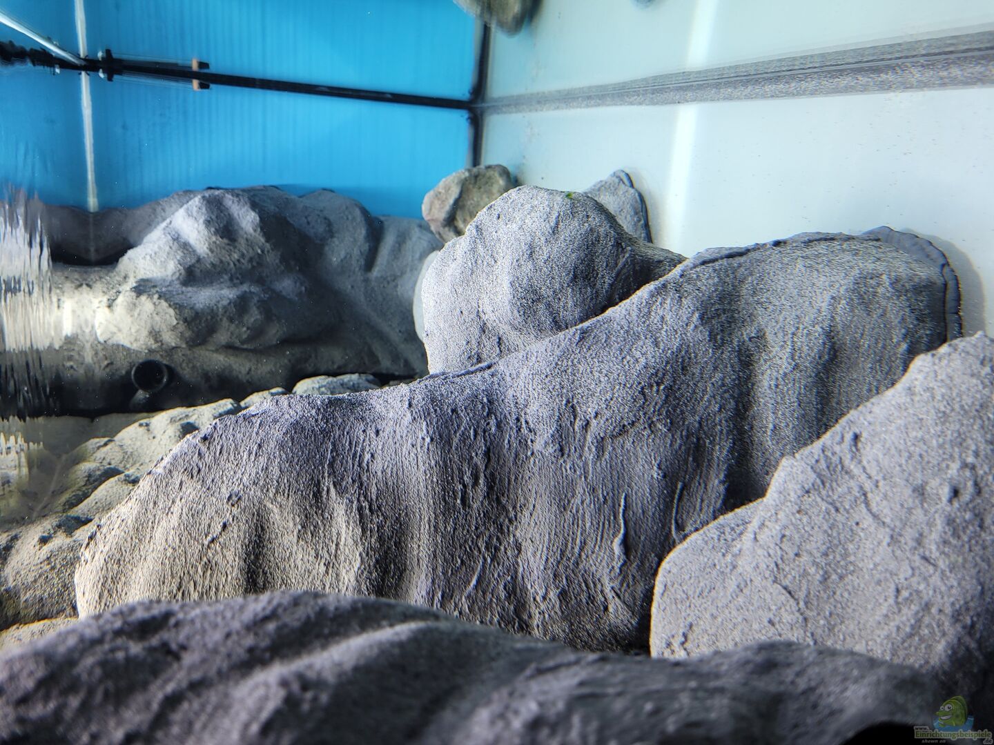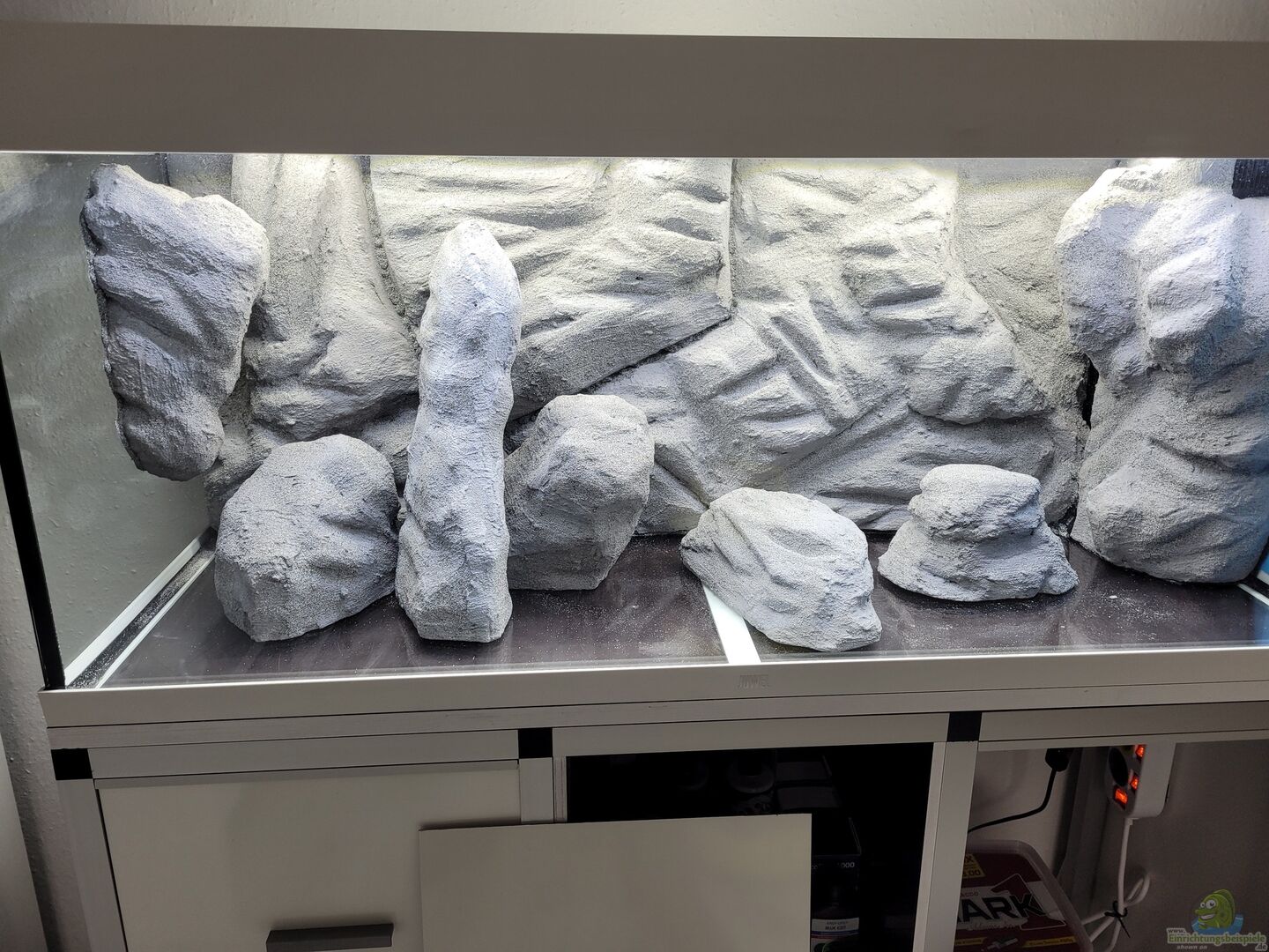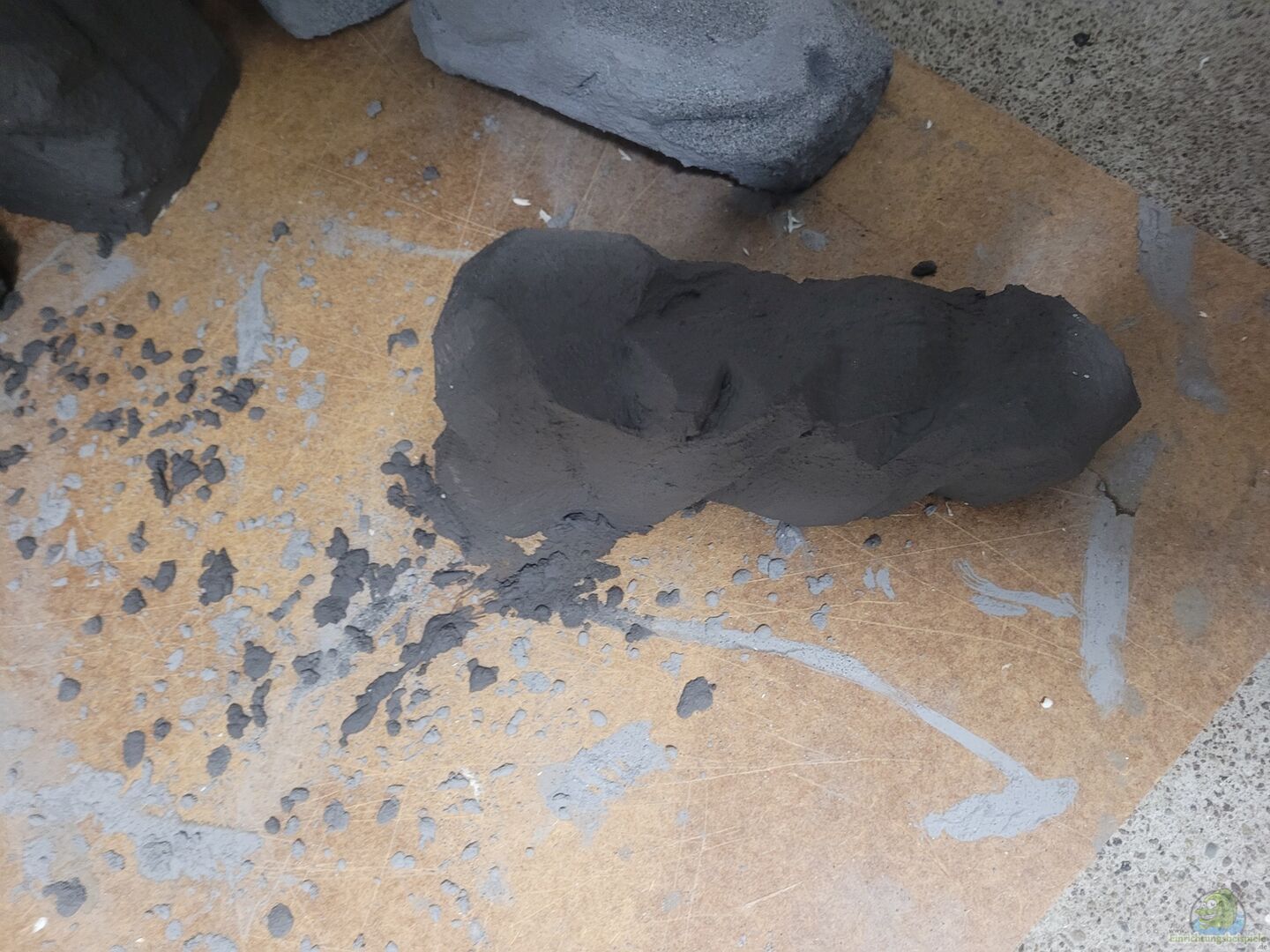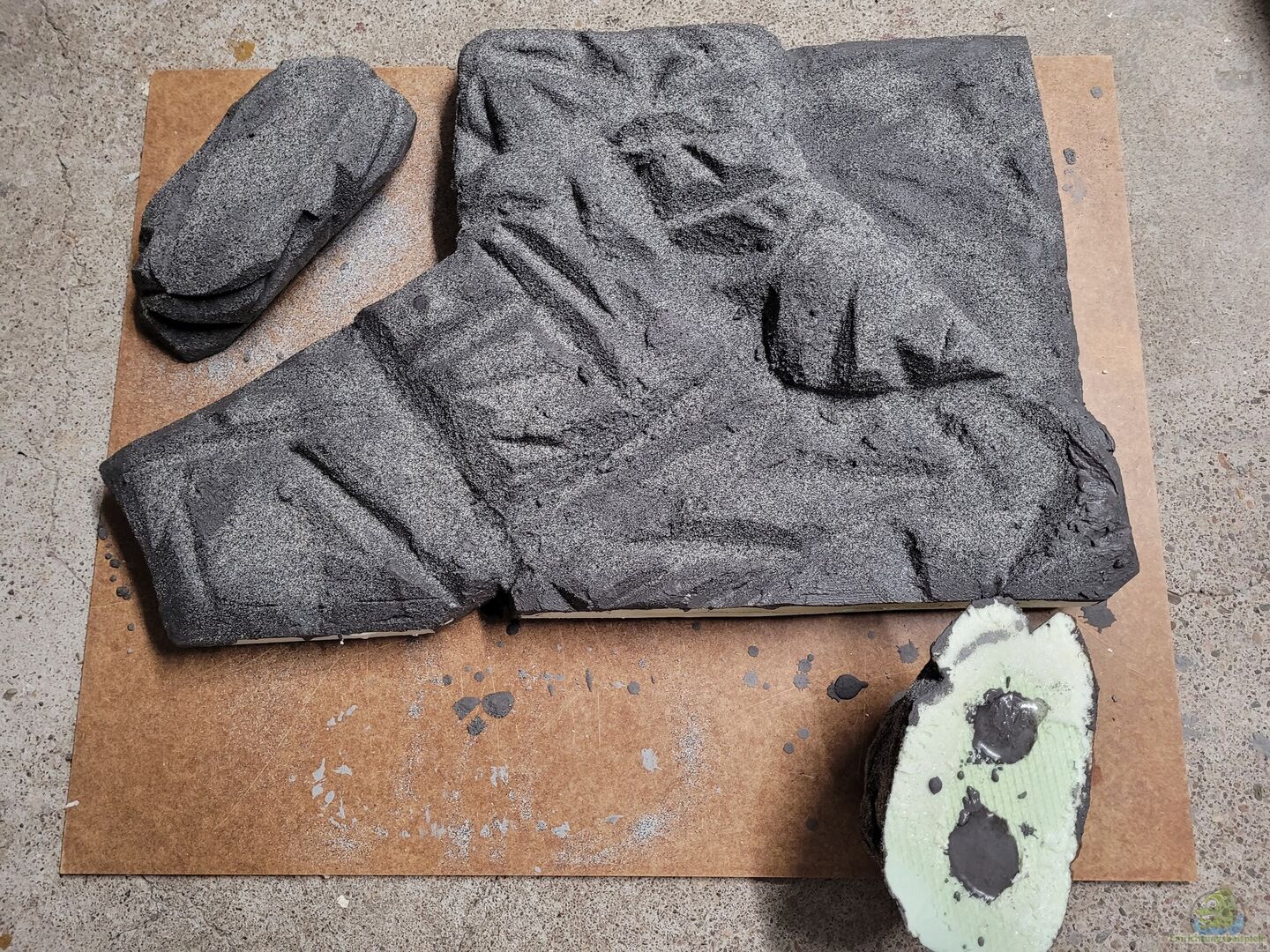 Selbstgebaute Rückwand und Module aus Styrodur und 10kg Silbermanns Scaper Cement sowie 10 Rockzolid Komodo Riverstones. In der Rückwand und ebenso in den Modulen sind Betongewichte verbaut und vergossen, im den Auftrieb deutlich zu verringern. Verklebt wurde das ganze dann mit dem Kompositkleber von Back to Nature. Effektiv blieben vom ursprünglichen Beckeninhalt dann etwa 200l netto übrig. Die Rückwand ist wesentlich schlanker, als sie rüberkommt. Sollte auf den Bildern mit dem Cuttermesser obendrauf auch ersichtlich sein.