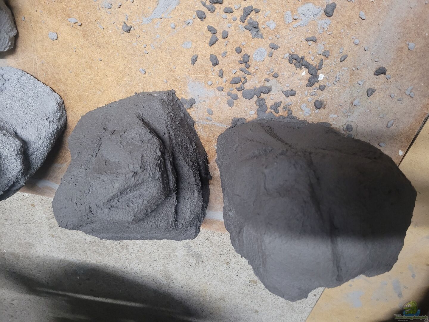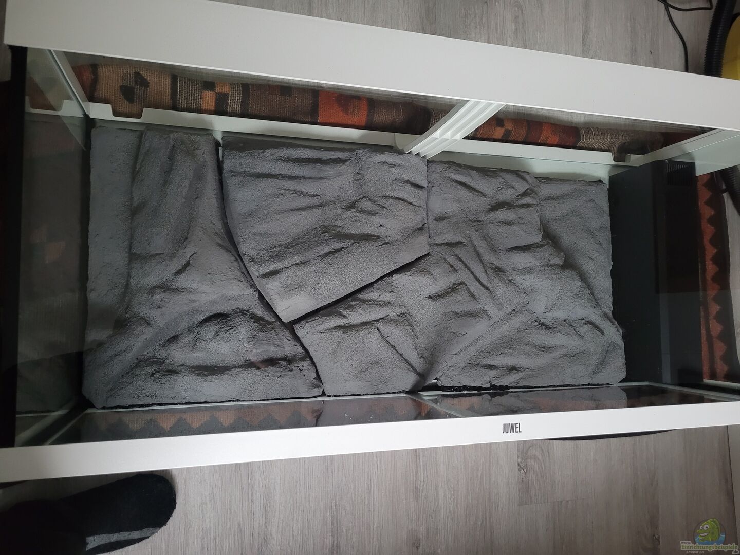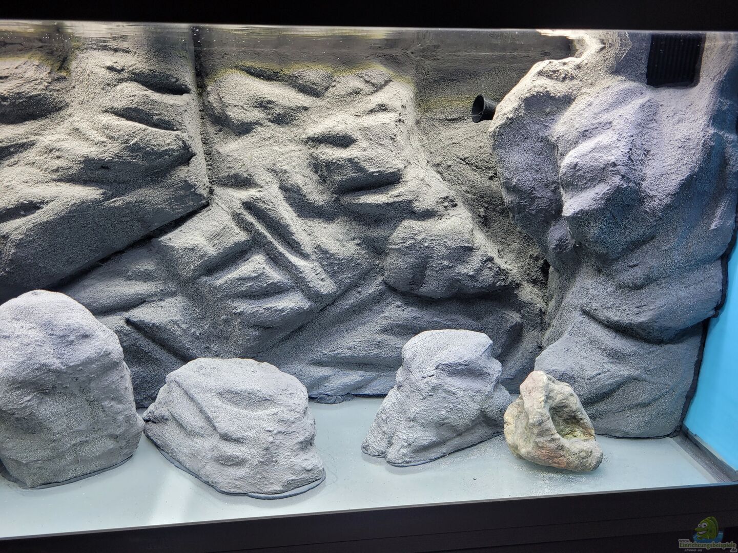 Selbstgebaute Rückwand und Module aus Styrodur und 10kg Silbermanns Scaper Cement sowie 10 Rockzolid Komodo Riverstones. In der Rückwand und ebenso in den Modulen sind Betongewichte verbaut und vergossen, im den Auftrieb deutlich zu verringern. Verklebt wurde das ganze dann mit dem Kompositkleber von Back to Nature. Effektiv blieben vom ursprünglichen Beckeninhalt dann etwa 200l netto übrig. Die Rückwand ist wesentlich schlanker, als sie rüberkommt. Sollte auf den Bildern mit dem Cuttermesser obendrauf auch ersichtlich sein.