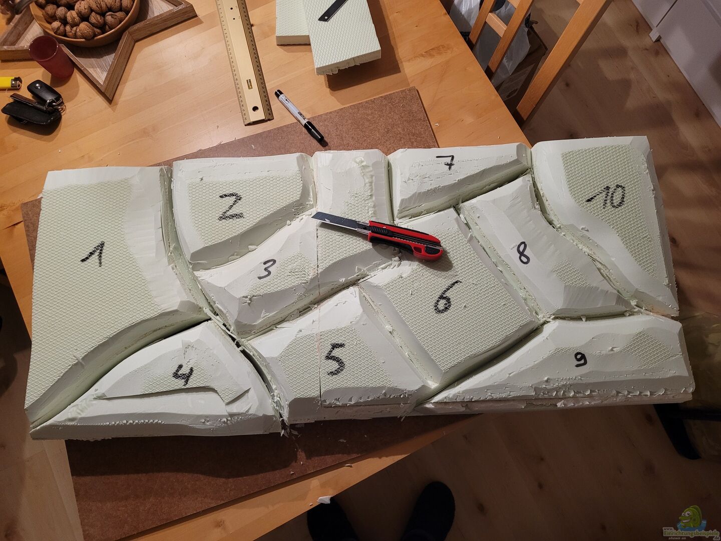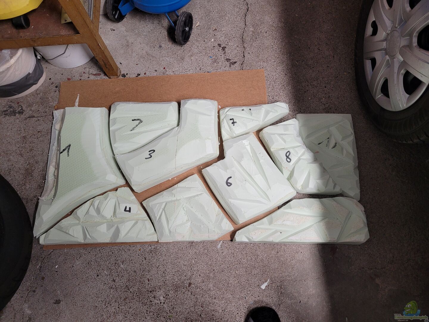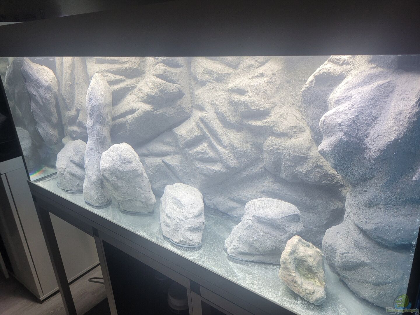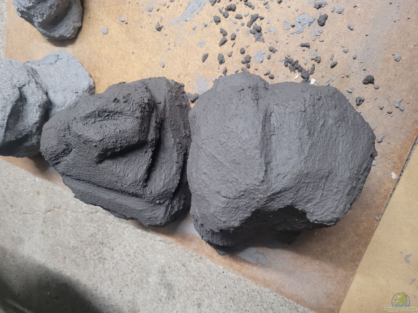 Selbstgebaute Rückwand und Module aus Styrodur und 10kg Silbermanns Scaper Cement sowie 10 Rockzolid Komodo Riverstones. In der Rückwand und ebenso in den Modulen sind Betongewichte verbaut und vergossen, im den Auftrieb deutlich zu verringern. Verklebt wurde das ganze dann mit dem Kompositkleber von Back to Nature. Effektiv blieben vom ursprünglichen Beckeninhalt dann etwa 200l netto übrig. Die Rückwand ist wesentlich schlanker, als sie rüberkommt. Sollte auf den Bildern mit dem Cuttermesser obendrauf auch ersichtlich sein.