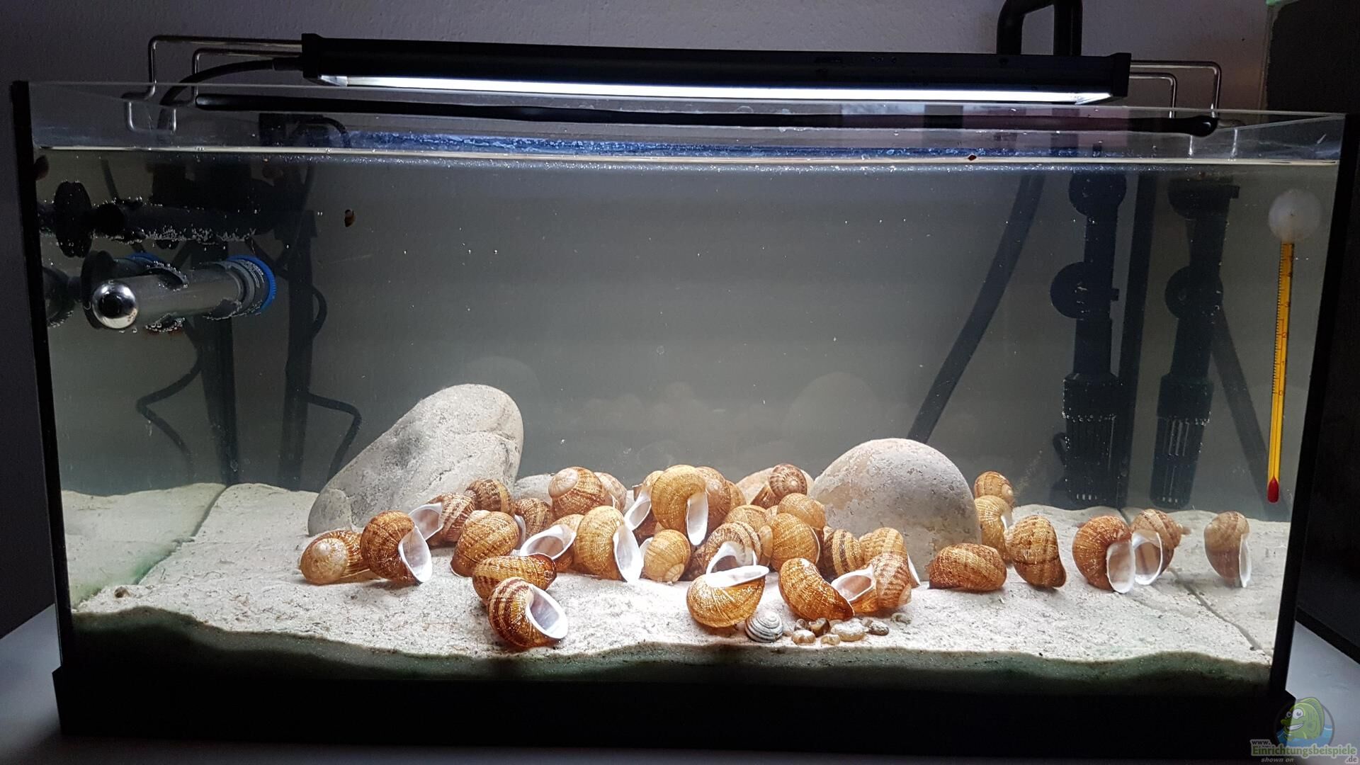 Drei Tage später waren sie alle schon schwer damit beschäftigt das Becken umzugestalten. Sand wurde umgeschaufelt, Schneckenhäuser verschoben und vergraben und die grossen Steine im Hintergrund mit Sand bedeckt.