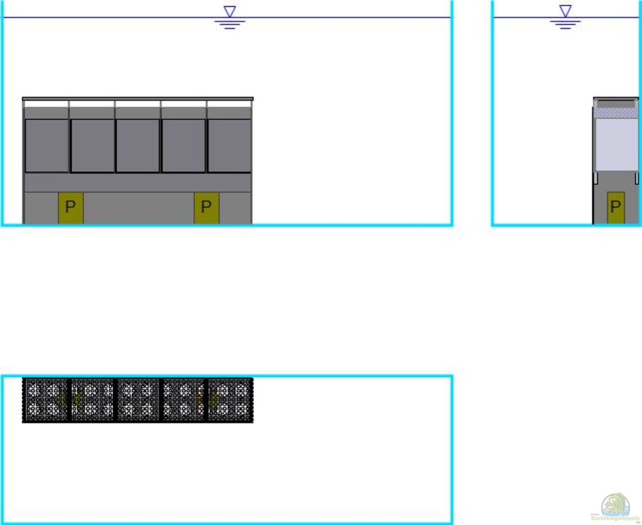 Der Filter ist hinter den Felsaufbauten versteckt. An den Seitenwänden sind die Steine mit Silikon verklebt. Auf der Deckplatte des Filters (Gitter aus schwarzem Plexiglas) liegen 5 Steine, die zru Filterwartung herunter genommen werden müssen.