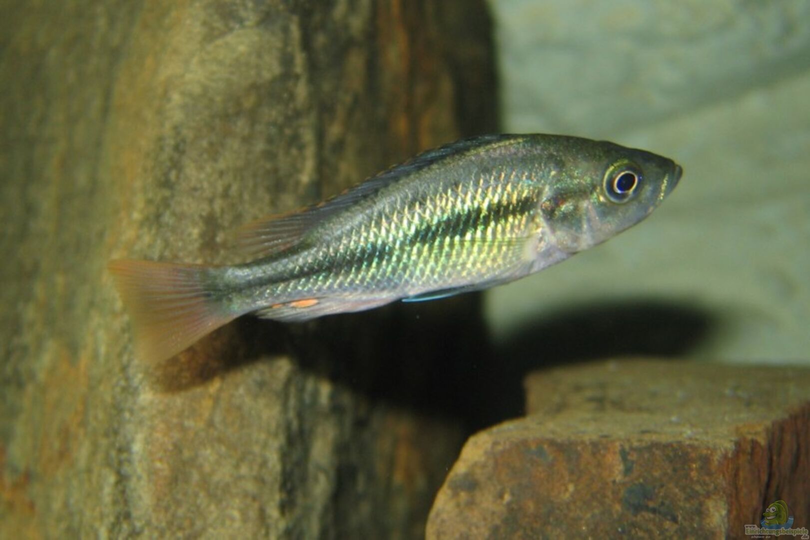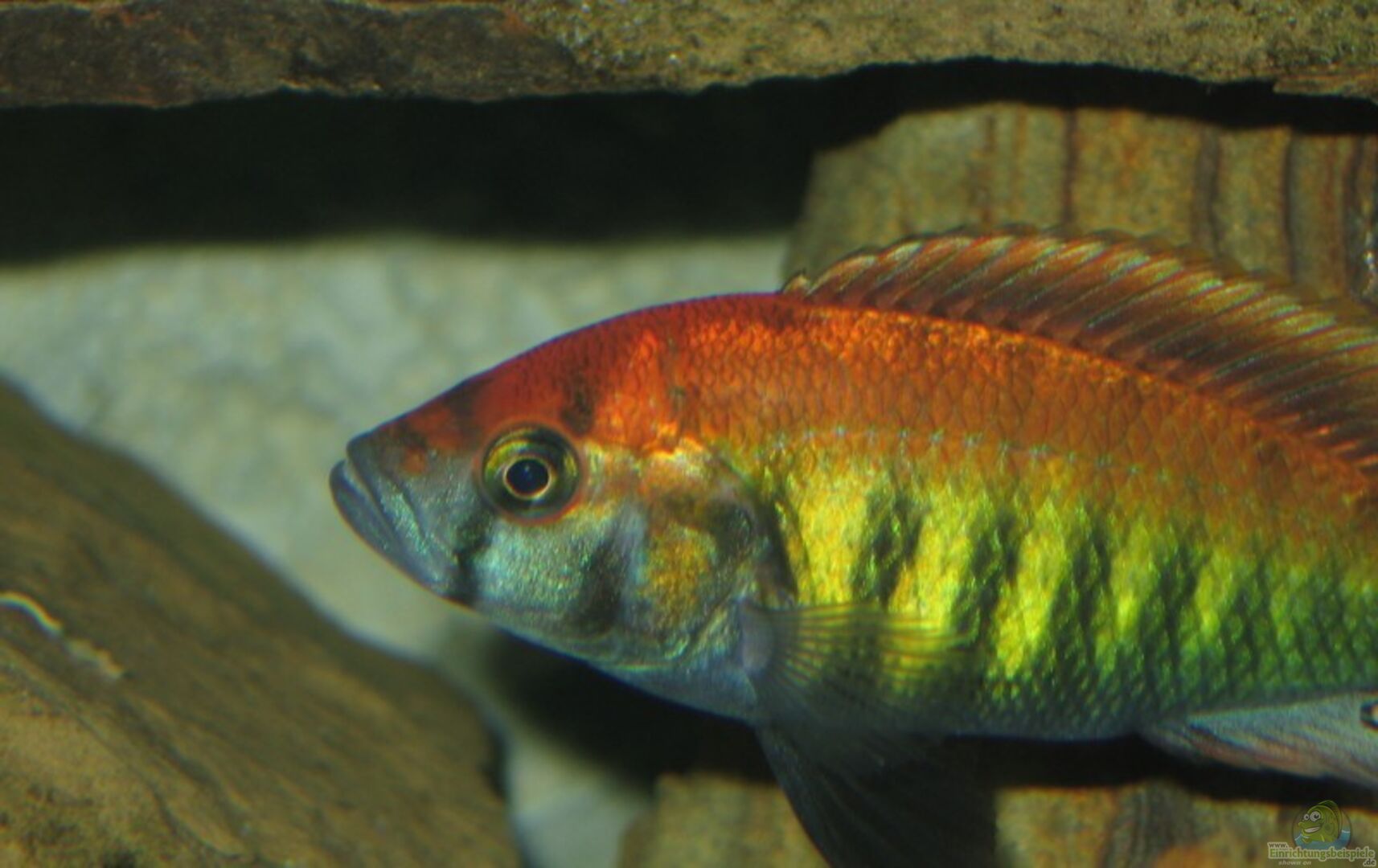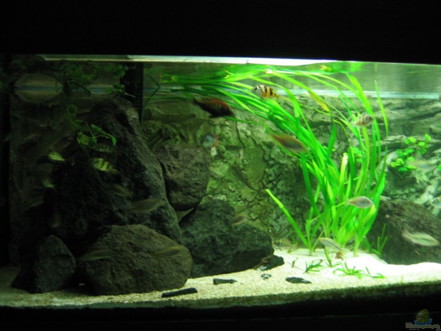 [05/05: z.Zt. 3 voll ausgefärbte Männchen, 1 besitzt linke Hälfte des AQ, die anderen beiden besitzen je eine grosse Höhle im rechten Steinhaufen, so da?? Sie sich gegenseitig (und auch CH44) nicht sehen können. Rest sind wahrscheinlich Weibchen.]