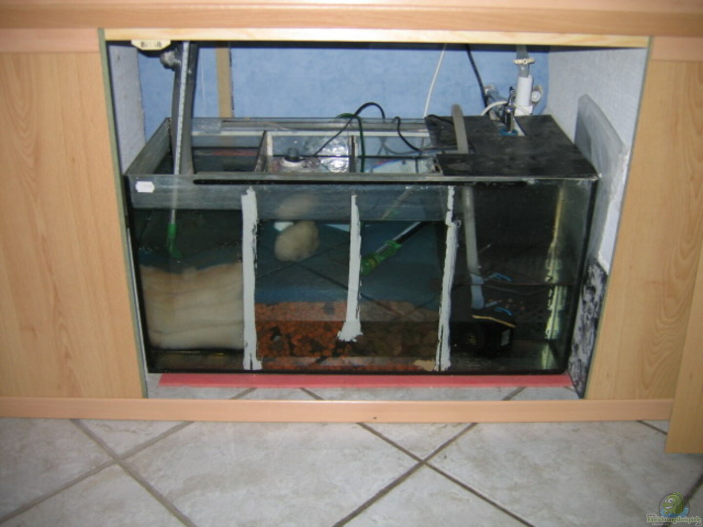 1.) 4-Kammerfilter unterm Becken( 80 x 35 x 40: 112 Liter), gefüllt mit Filterwatte, Lavabruch und Blähton (von Hydrokultur), ausserdem blaue Schumstoffmatten. Pumpe (Hagen Powerhead 802 1500 l/h) l/h: Wasser läuft durch ??berlauf in das Filterbecken unterm Aquarium und wird von Pumpe oben wieder reingepumpt.