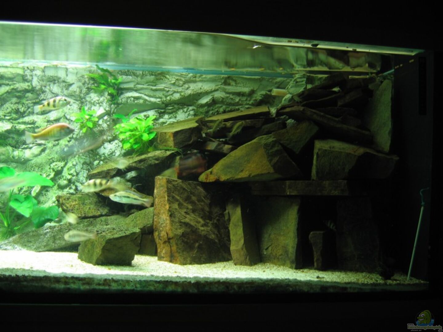 Rückwand: Eigenbau aus grauem Fugenmörtel. Drei Teilstücke wurden ´gegossen´ und die Oberfläche mit einem Spatel in Form gebracht. Die drei Stücke wurden dann isn Aquarium gebracht und dor mit Fugenmörtel verbunden. Wässerungszeit: 2 Monate mit Wasserwechsel, bis Leitfähigkeit konstant blieb.