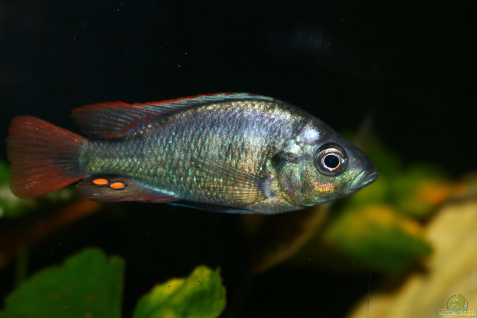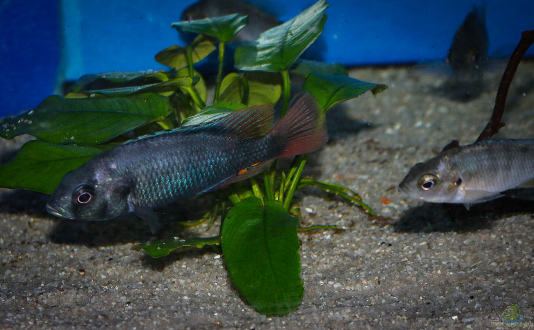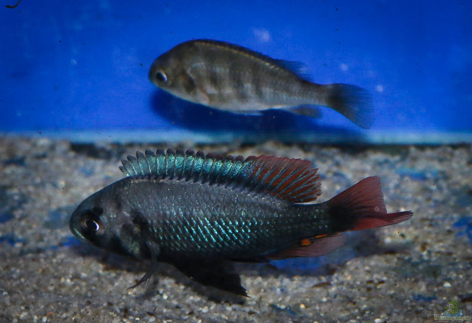 Männchen: Der Körper ist blauschwarz mit einem metallisch blauen Schimmer im oberen Körperbereich. Vier bis fünf schwarze Querbinden sind über den Körper verteilt, jedoch nicht immer zu sehen. Rücken- und Afterflosse haben einen tiefroten breiten Rand, die Schwanzflosse ist völlig rot.