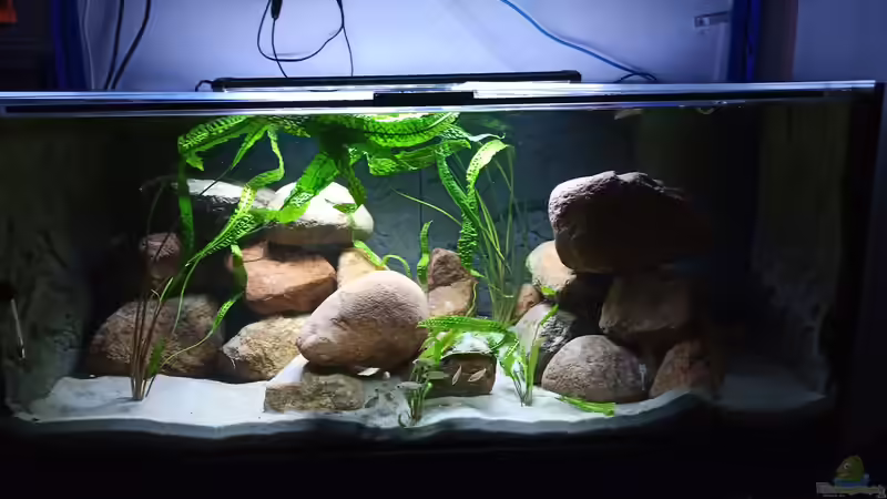 15.02.2021 - Inbetriebnahme mit einem Teil des Bodengrundes und noch künstlicher Deko (zu wenig).