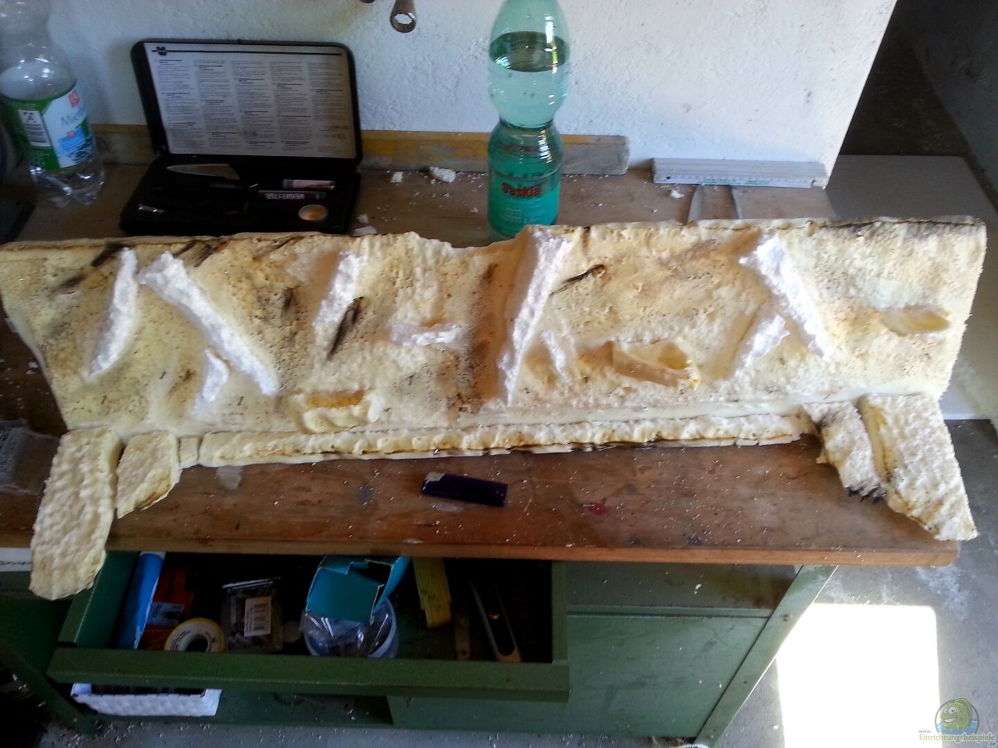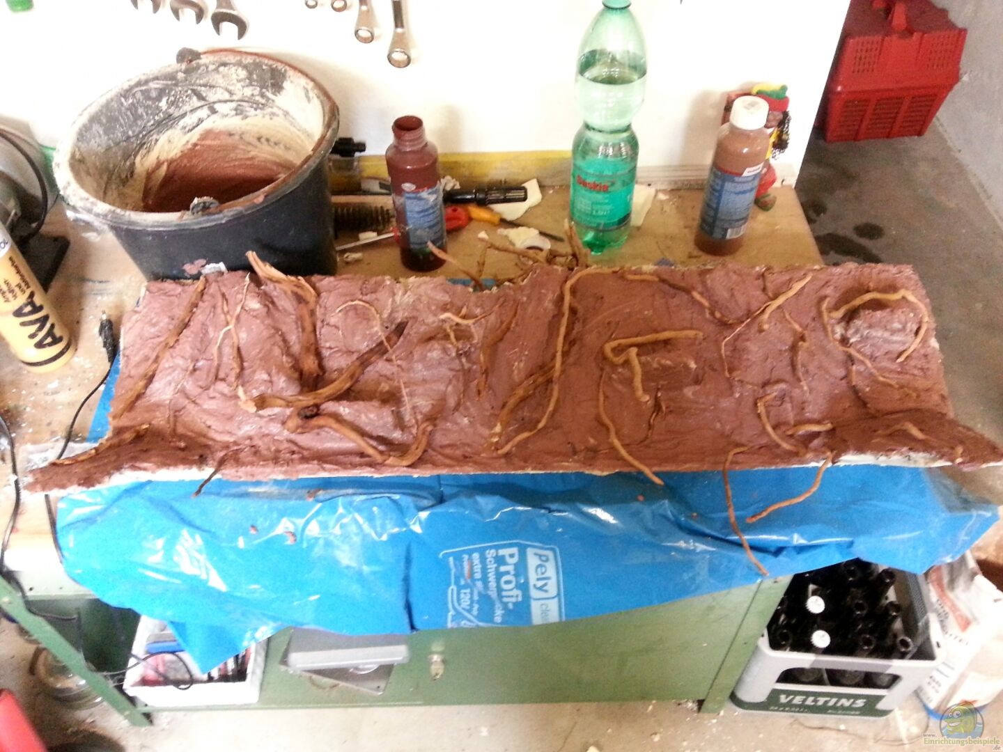 Die Rückwand besteht aus Styropor und Styrodur. Anfangs habe ich eine grobe Struktur geschaffen und diese verklebt. Danach würde das ganze etwas "angesenkt" um weitere Struktur zu schaffen. Dann habe ich alles mit Gewebematten belegt um anschliessend Gewebespachtel gemischt mit Abtönfarbe aufzutragen. Beim zweiten Schub Spachtel wurden ??ste und Wurzeln mit eingebracht. Zum schluss habe ich das Ganze mehrfach mit Harz versiegelt.