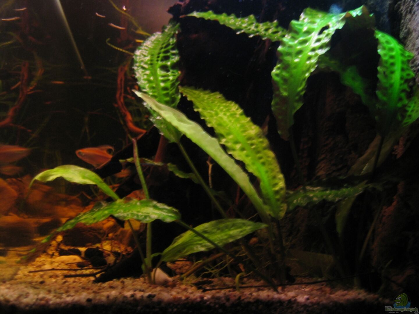 Links hinten im Becken eine Aponogeton longiplumulosus eingesetzt; die langen Blätter liegen flutend Richtung Beckenmitte