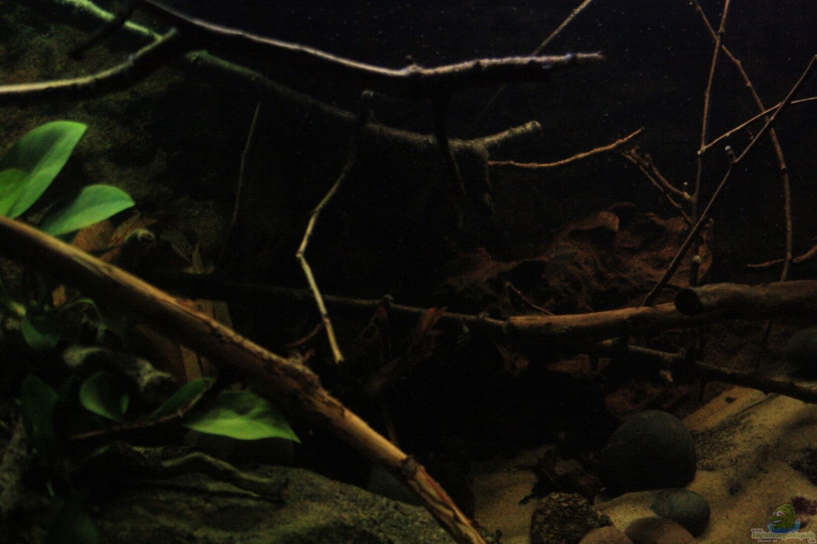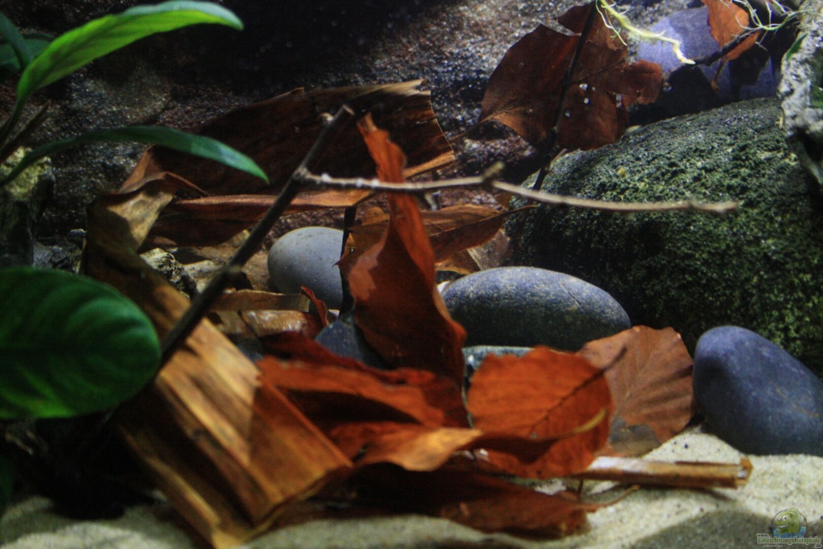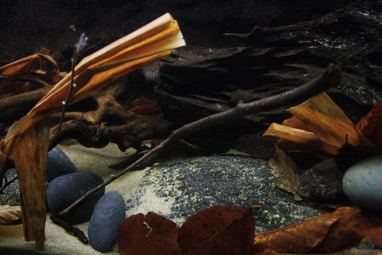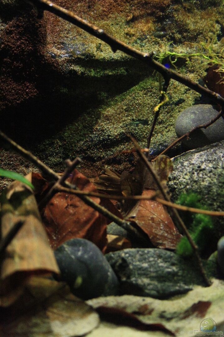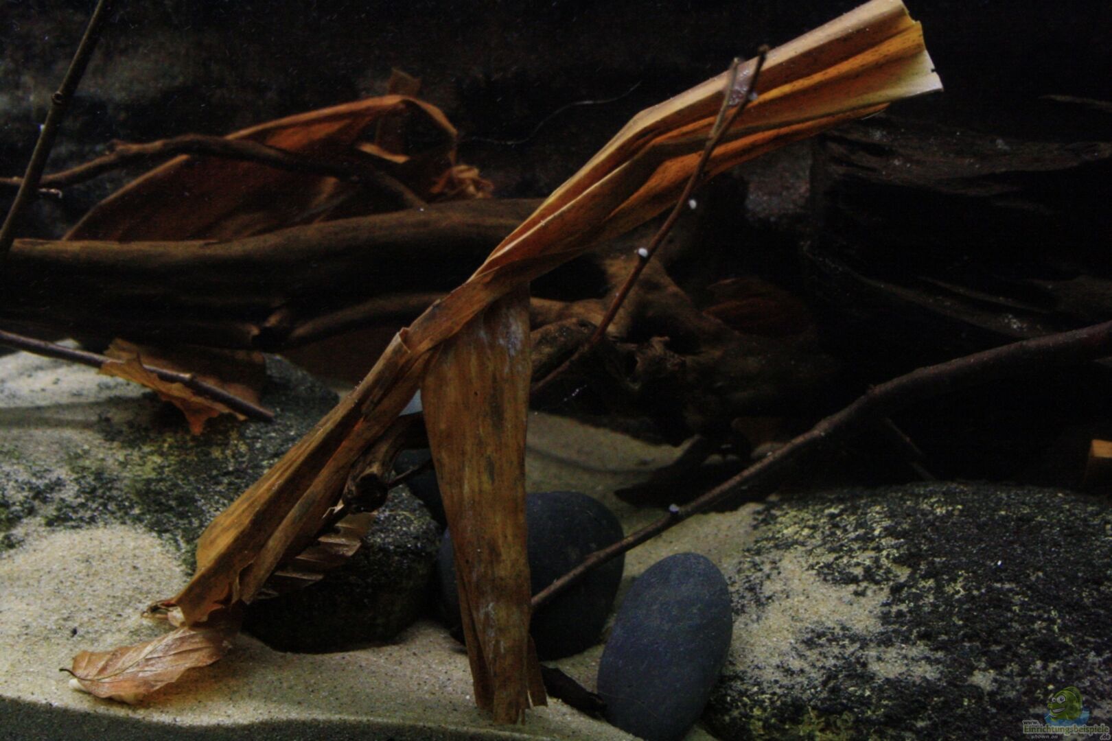 Die rechte Beckenseite wird von 2 grö??eren Anubias congensis flankiert, überall am Boden ist Laub, ??ste und Zweige sowie wenige gro??e Wurzeln.