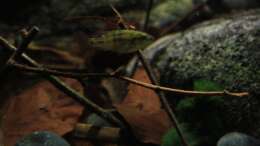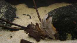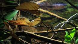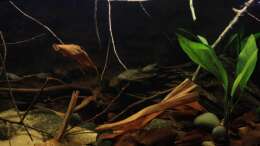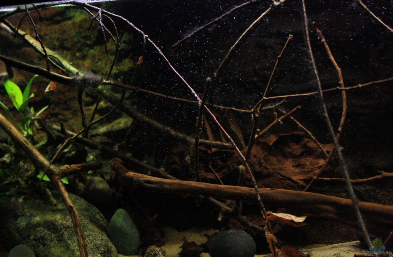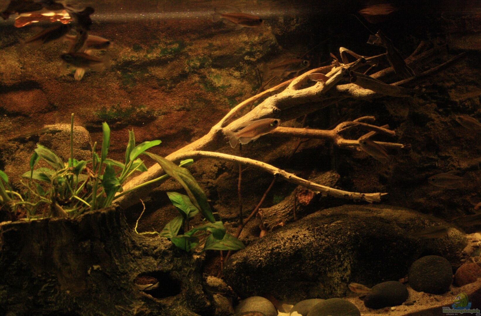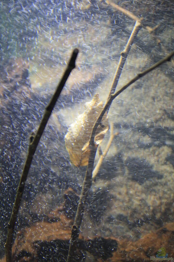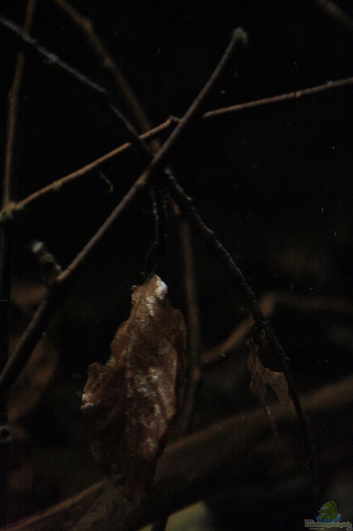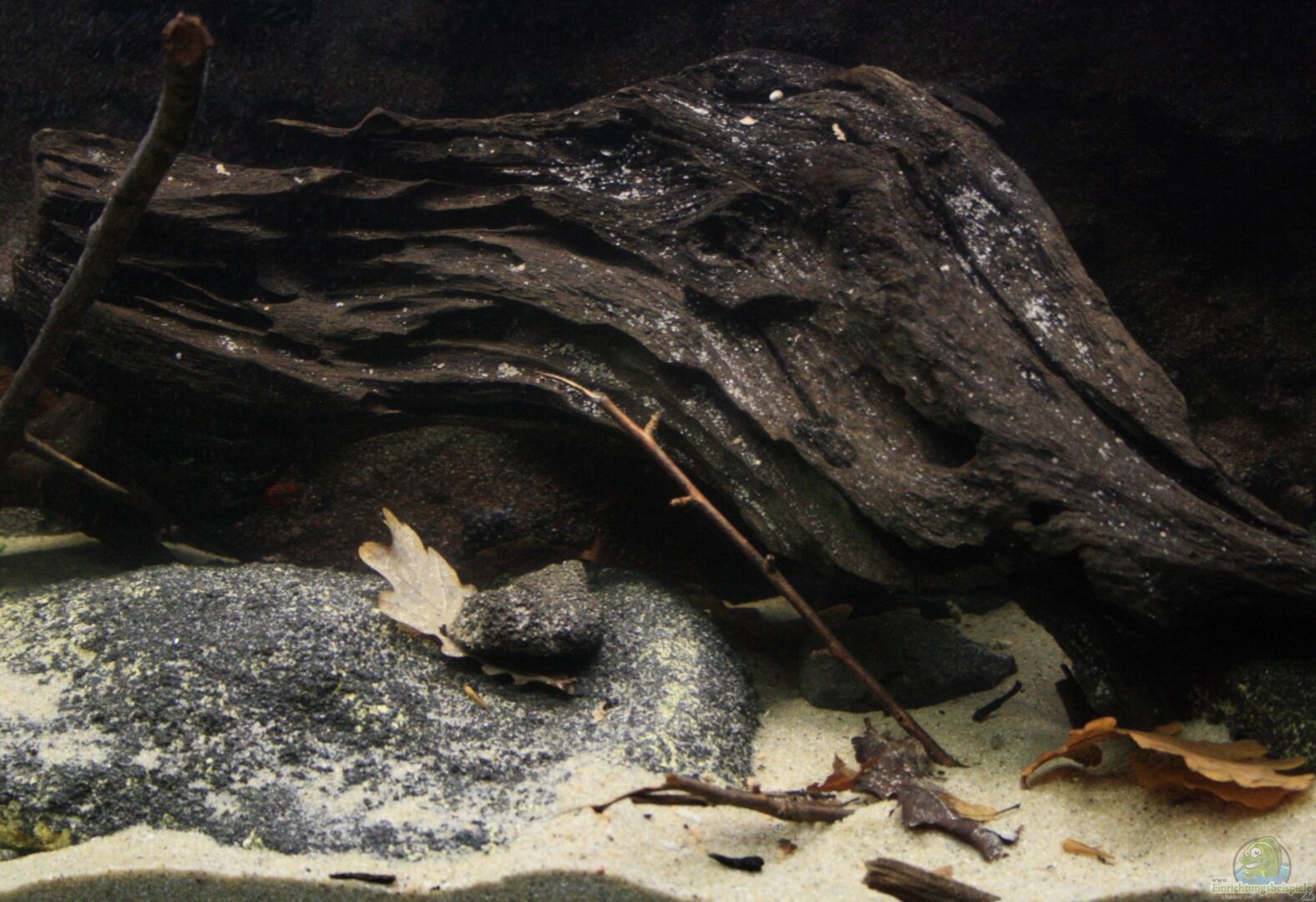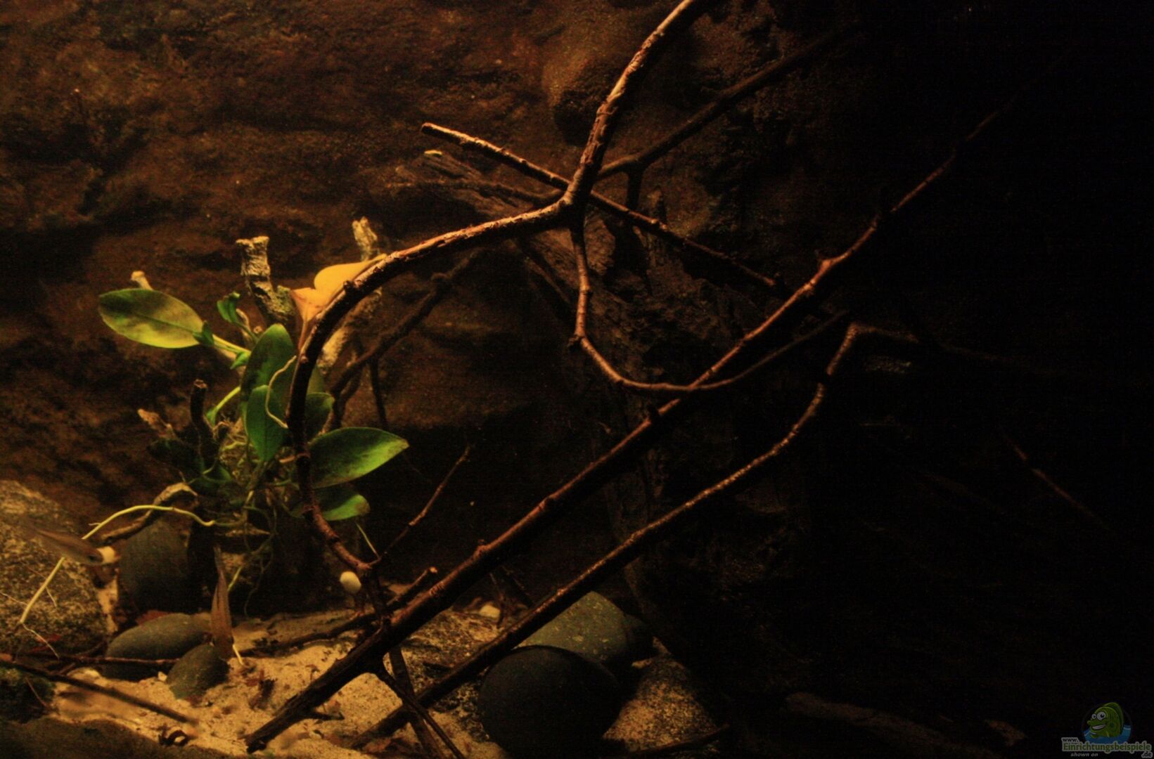 Die rechte Beckenseite wird von 2 grö??eren Anubias congensis flankiert, überall am Boden ist Laub, ??ste und Zweige sowie wenige gro??e Wurzeln.