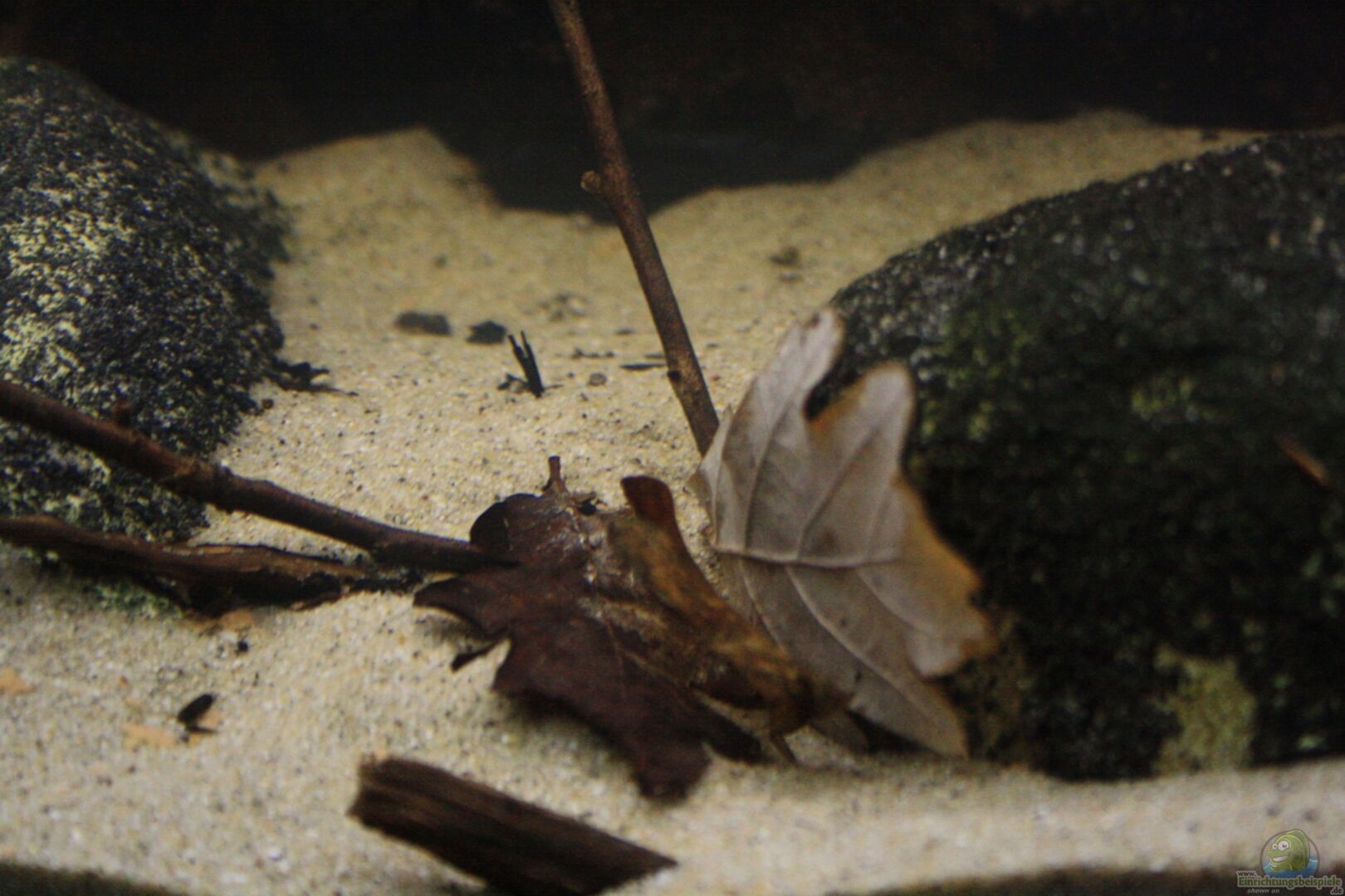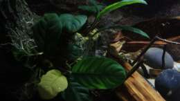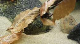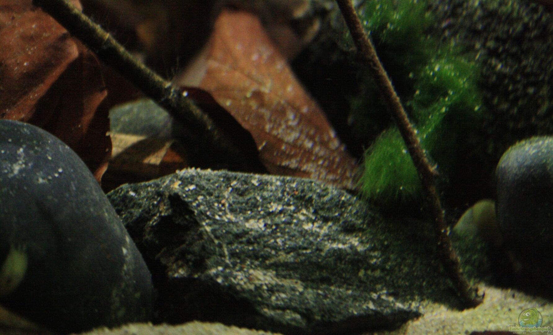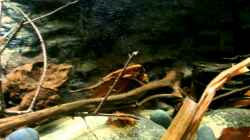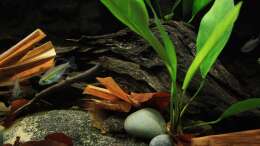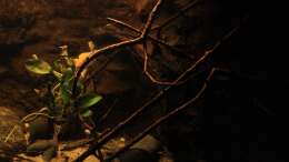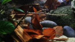 Das ganze Becken wurde noch mit runden Flussteinen dekoriert sehr viel Laub und mittig ein künstlicher Ast an dem 2 kleinere Anubias coffeefolia gesetzt wurden lä??t die Bepflanzung zur Mitte gleiten.
