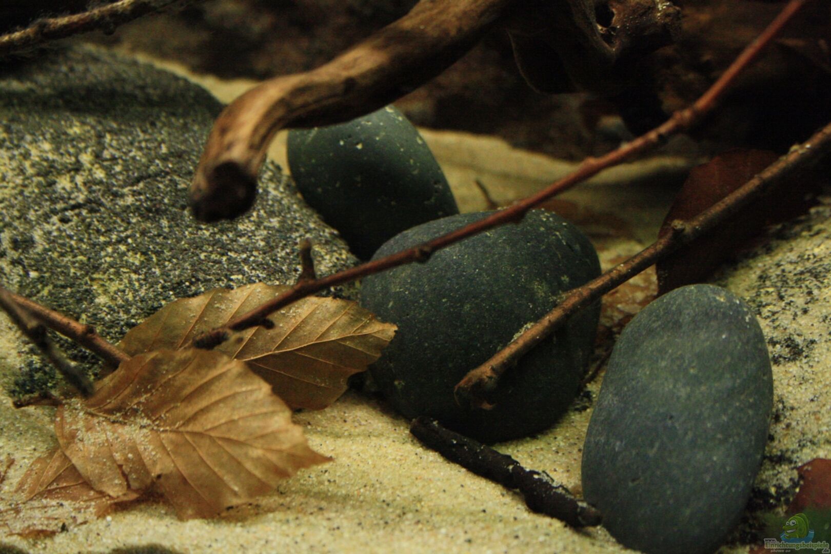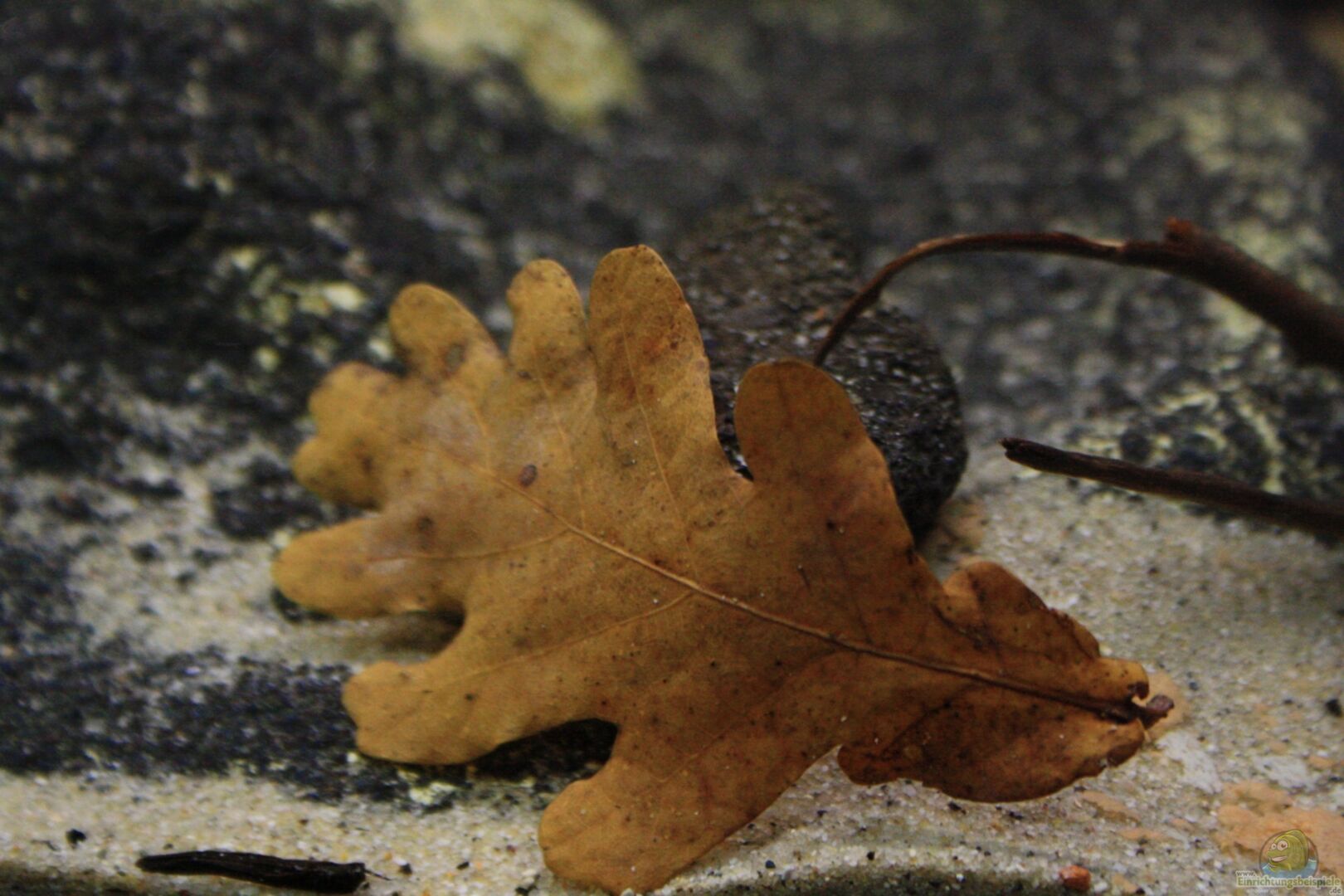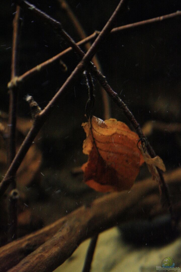 Dabei stecken diverse ??ste und Zweige sowie Wurzeln und Laub in Form von (Buche, Eiche und Bananenblättern) ins Becken dekoriert, teilweise wurden ??ste und Zweige in den Bodengrund gesteckt, hierbei soll alles nach einem durcheinander wirken und wild aussehen.