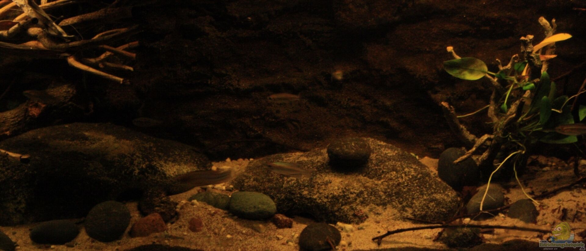 Die Beleuchtung ist schwummerig und soll im Wasser bewegt wirken, in Verbindung mit den Luftblassen und durch die Tropic von Suna Eco soll das ganze dann naturnah soweit es eben geht bei einem Aquarium umgesetzt werden.