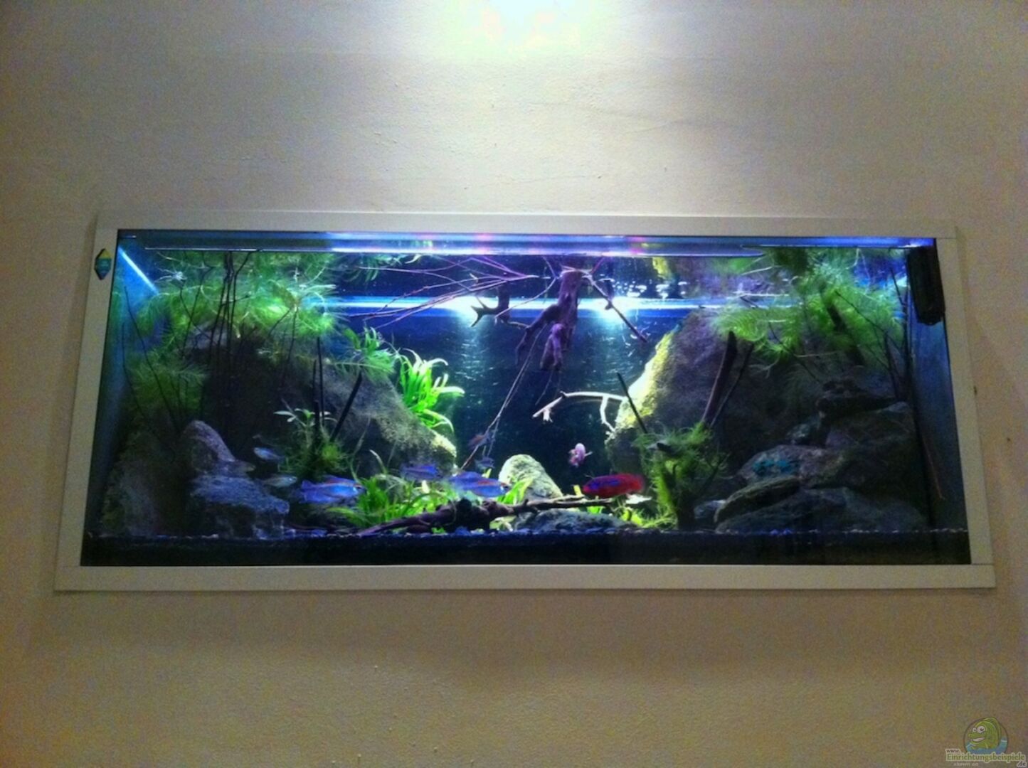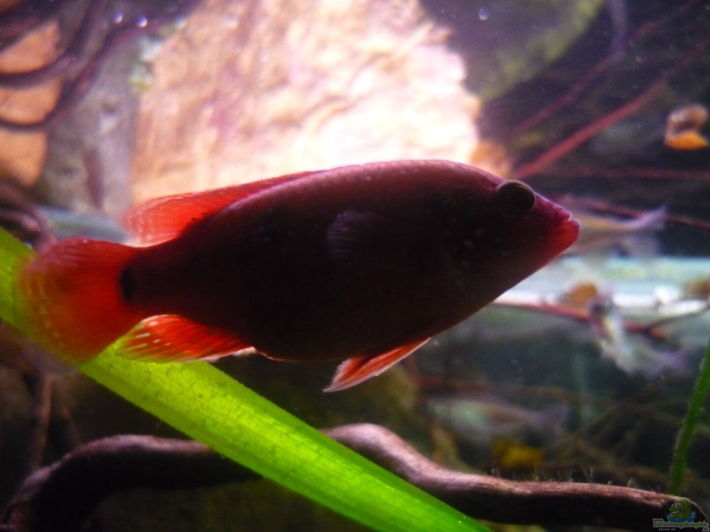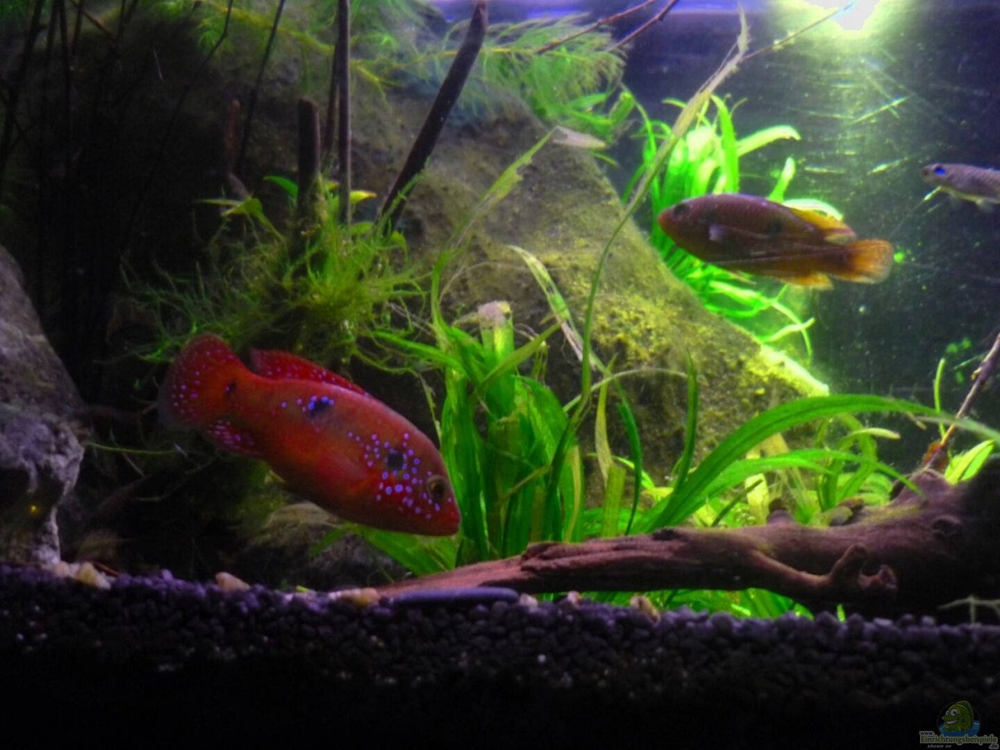 mit der Beleuchtung experimentiert und für gut befunden, Tigerlotus und Hornkraut ins Becken gegeben, zwei weitere Hemichromis sind eingezogen ich hoffe das ein Männchen dabei ist und sich dadurch endlich ein Pärchen findet, neue Bilder gefertigt. Sobald der Lotus etwas an Grö??e zugenommen hat kommen neue Gesamtaufnahmen.