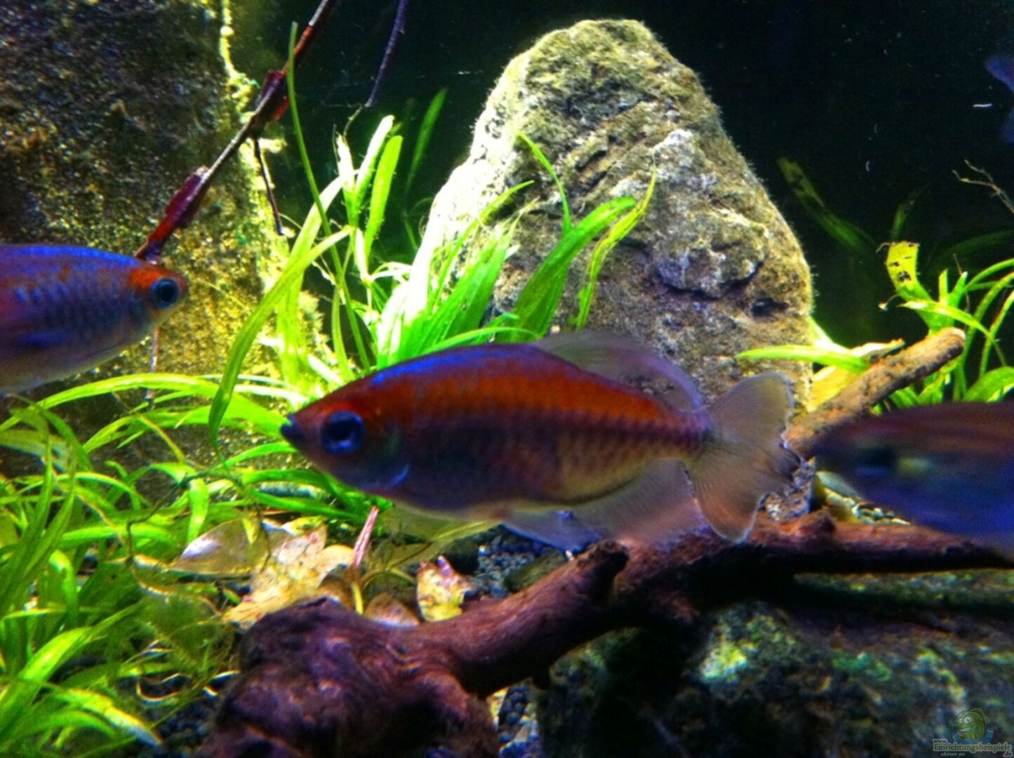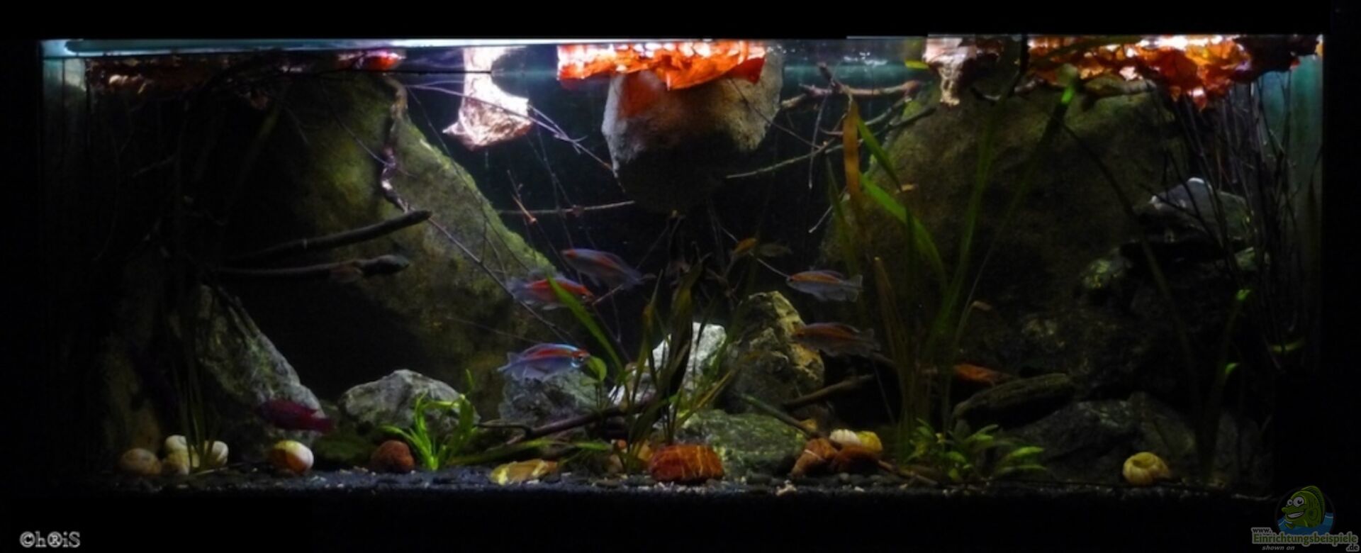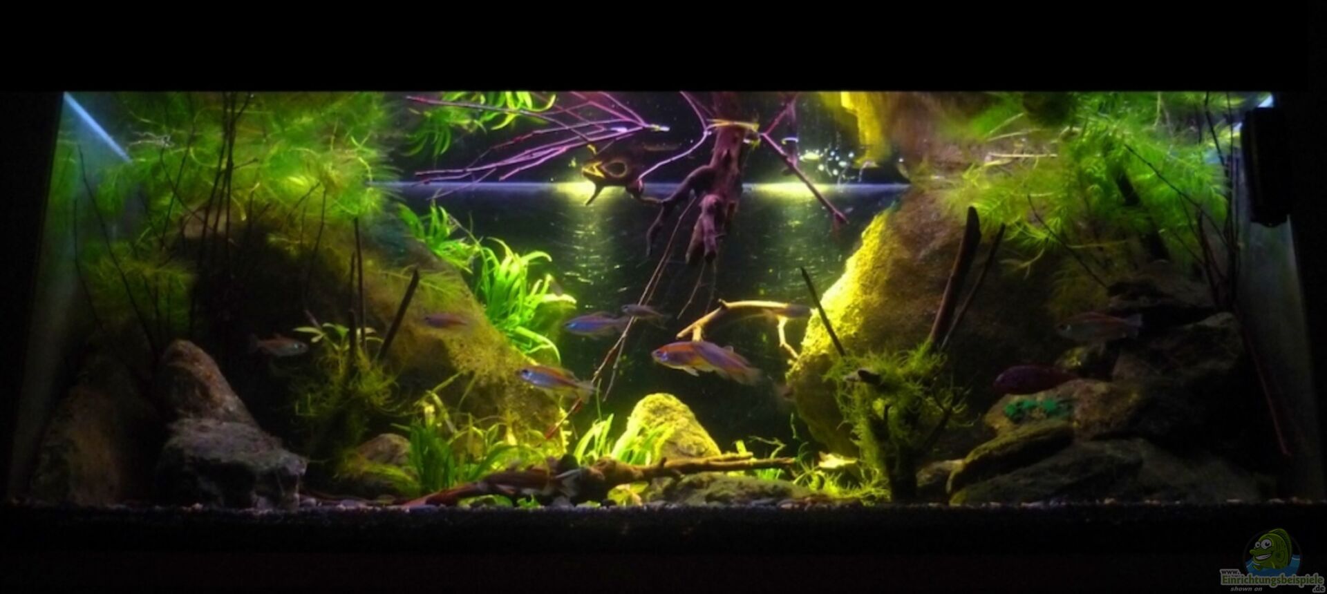 mit der Beleuchtung experimentiert und für gut befunden, Tigerlotus und Hornkraut ins Becken gegeben, zwei weitere Hemichromis sind eingezogen ich hoffe das ein Männchen dabei ist und sich dadurch endlich ein Pärchen findet, neue Bilder gefertigt. Sobald der Lotus etwas an Grö??e zugenommen hat kommen neue Gesamtaufnahmen.