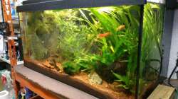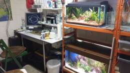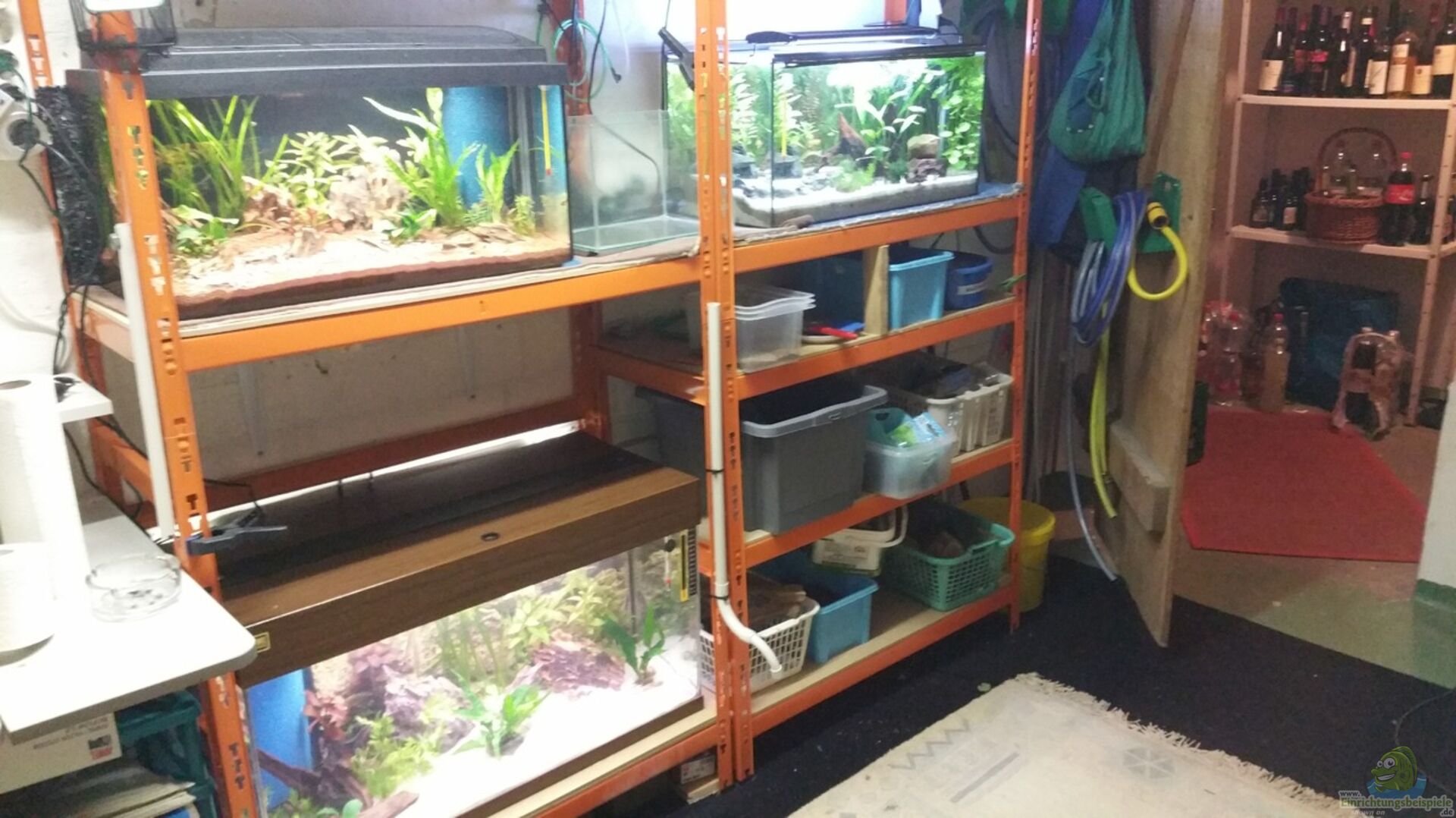 Das Becken steht hier im Kellerregal --- ja man kann schon sagen mit der Zeit gewachsenen Aquaristikraum - war nie meine Absicht, bin da so reingeschlittert. Es tümmelt sich hier so alles was sich bei meinen neuen Hobby so angesammelt hat - werde noch zum AquaMessi :-)