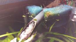 Eck HMF mit Kabelkanal und Aquariumsilikon eingeklebt. Der eingeklemmte Filerschwamm ist mittelporig. Betrieb mit einen Luftheber und Gadena Bewässerungsdüse und PVC-U Rohr.